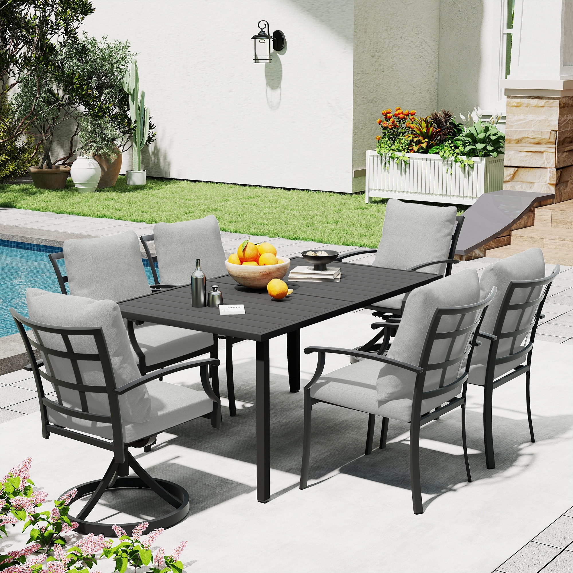 IvyGlow 7-Piece Black Metal Patio Dining Set with Rectangular Table, 2 Swivel Dining Chairs and Gray Cushions