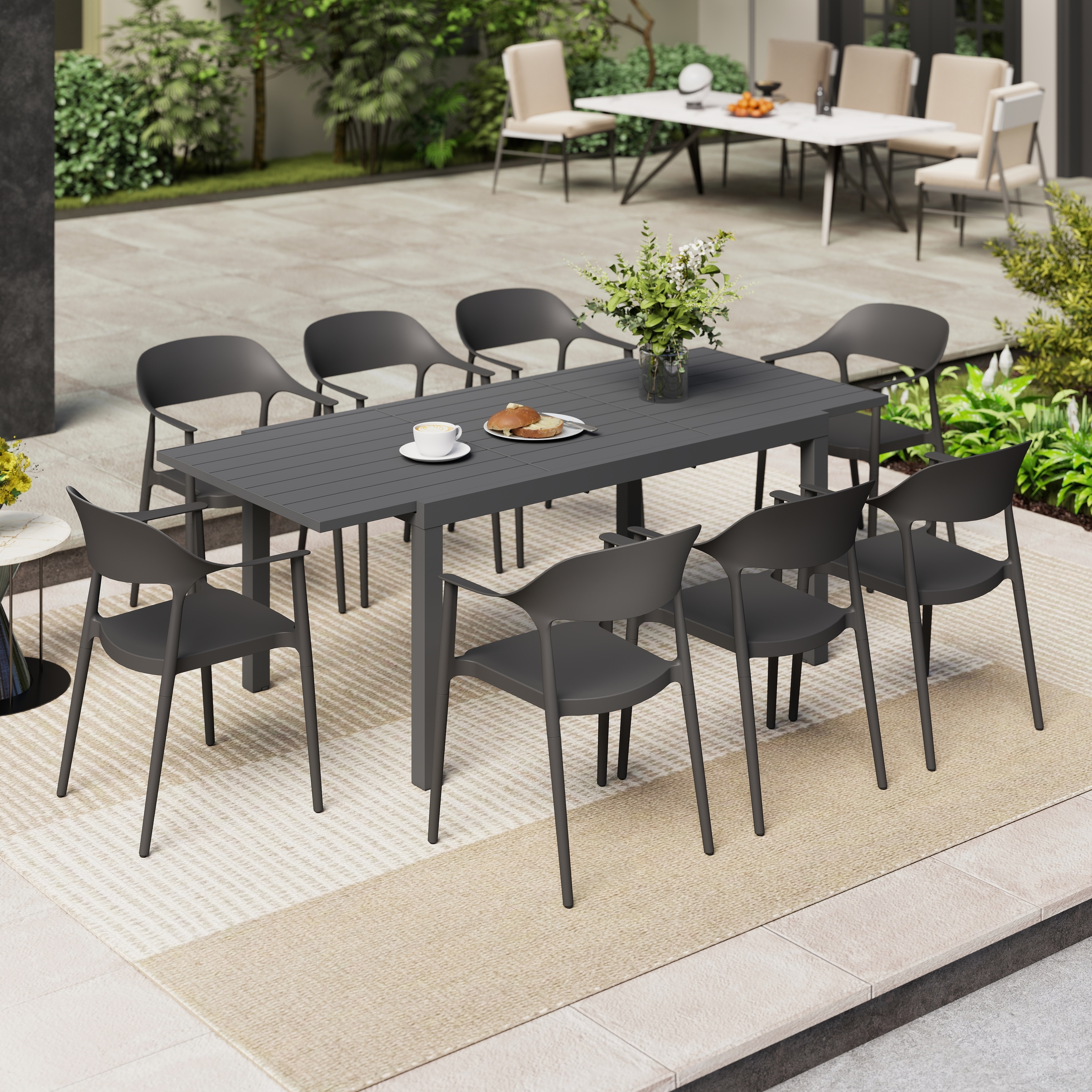 Outdoor Dining Set 9-Piece Stackable Plastic Lightweight Curved Backrest Armchair and Extendable Dining Table