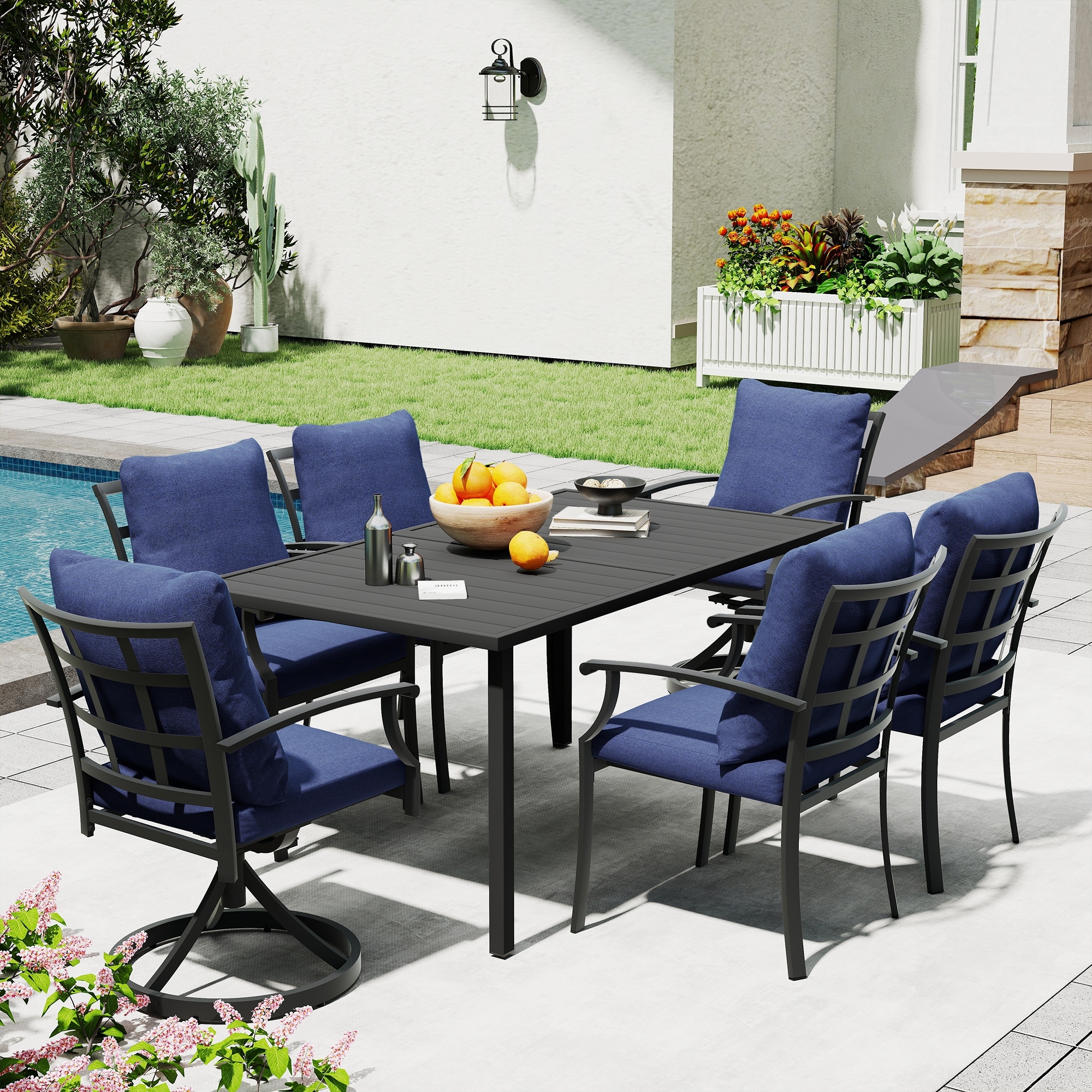 7 Pcs Outdoor Dining Set, Patio Aluminum Furniture Set with 2 Swivel Rocker Chairs, 4 Dining Chairs and Rectangular Table
