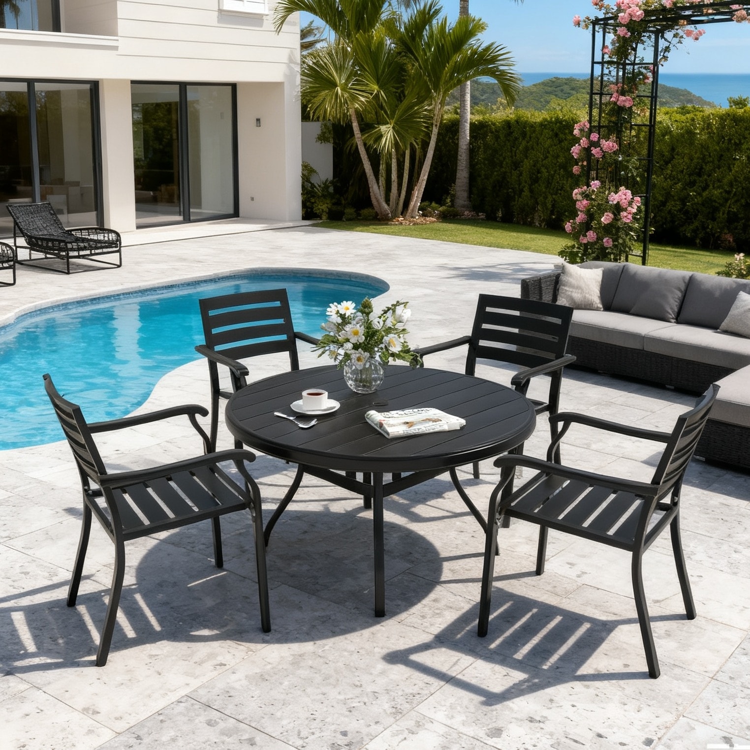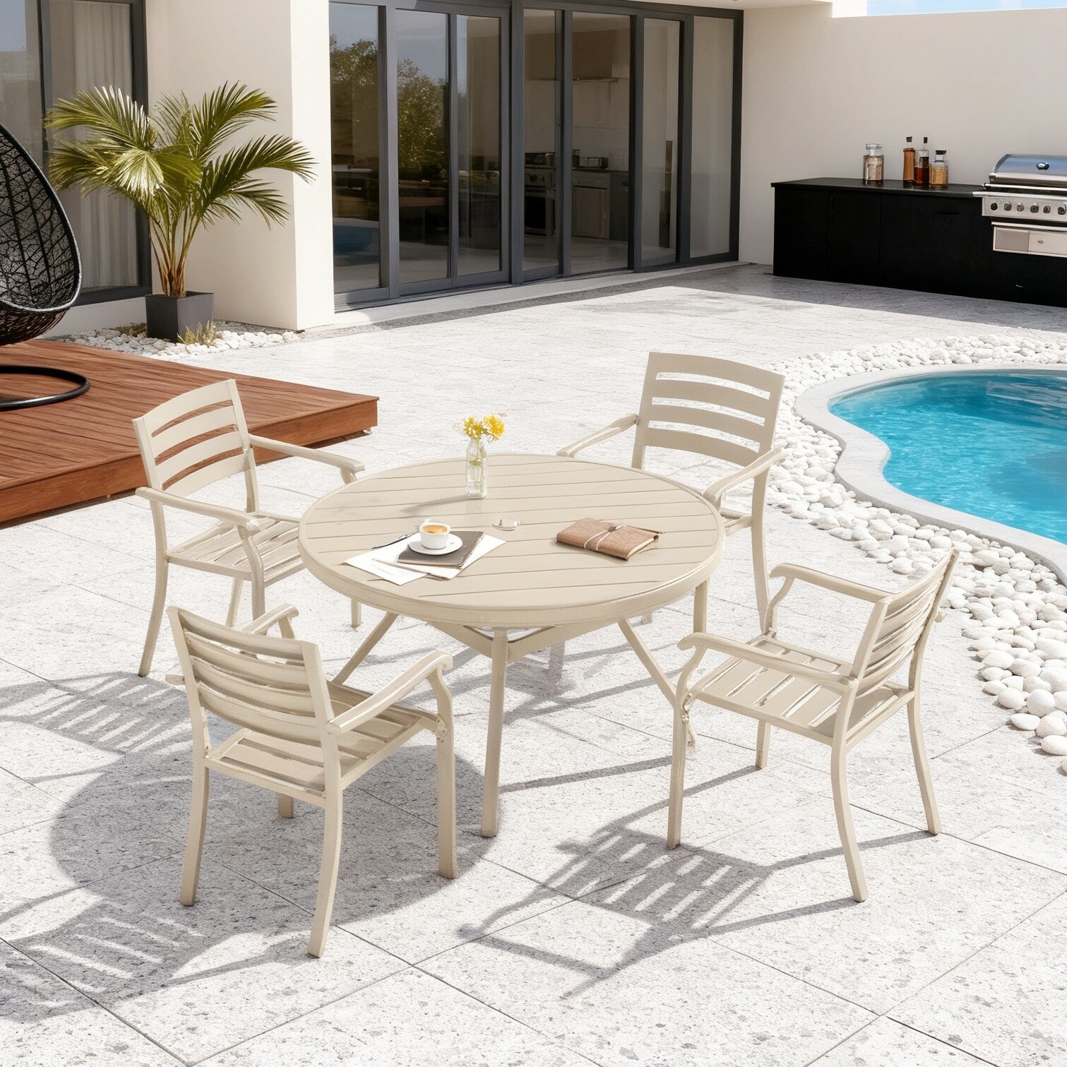 5-Piece Outdoor Metal Round Dining Table Set with 4 Stackable Chairs