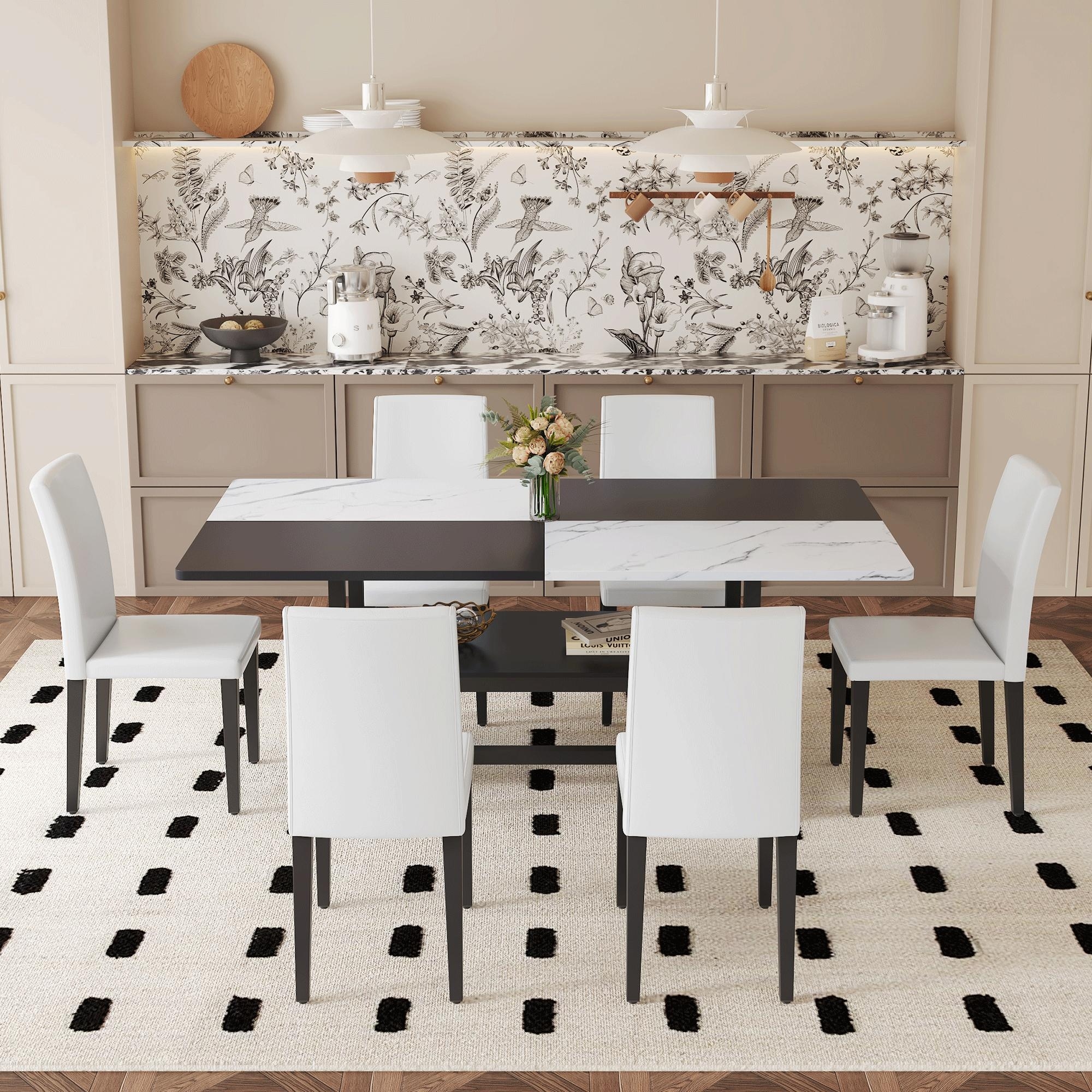 6 Piece Dining Table Set,63" Faux Marble Dining Table w/Chairs & Bench