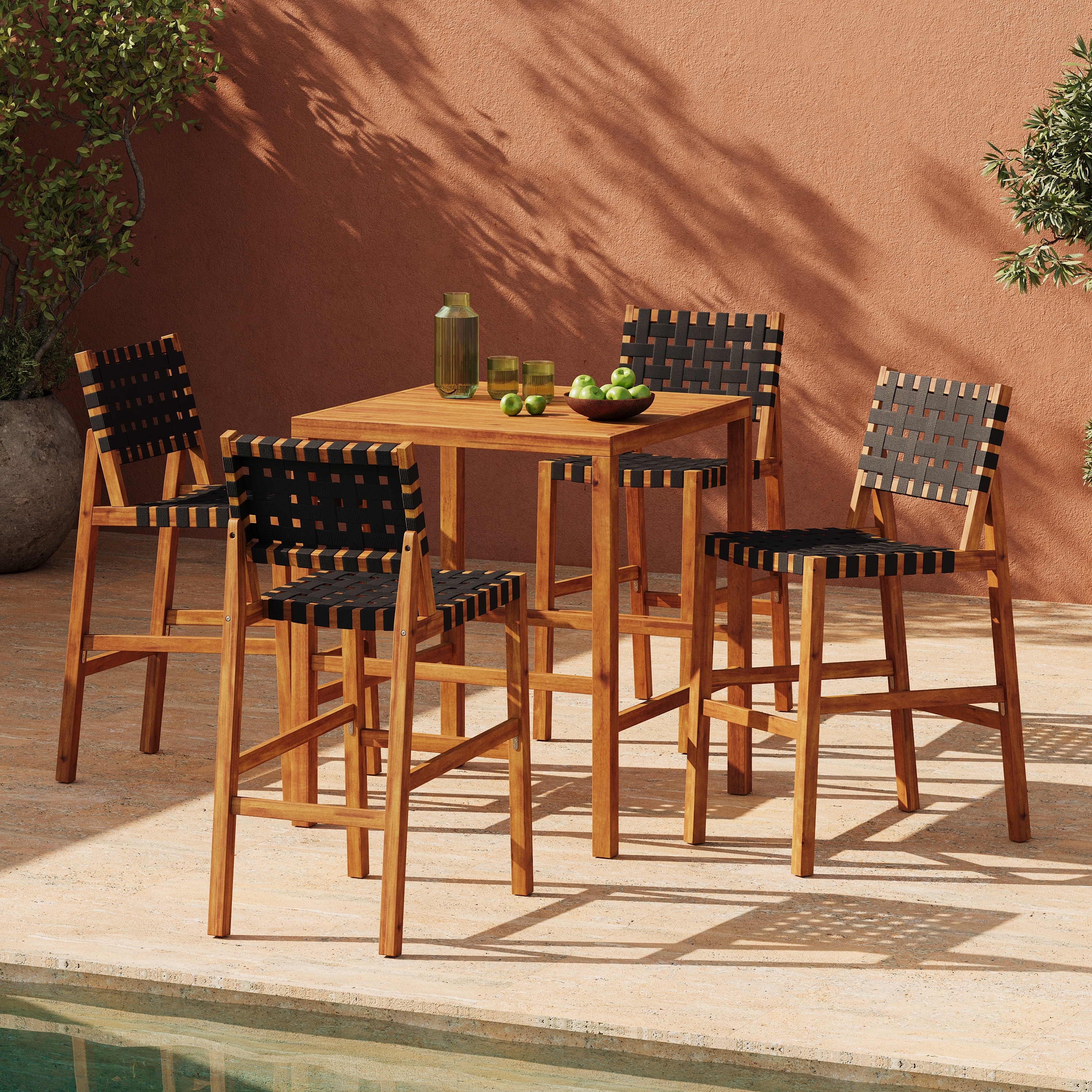 Christopher Knight Home - Solvanta Modern Solid Wood Outdoor 5-Piece Bar Height Dining Set with Rope Woven Bar Stools