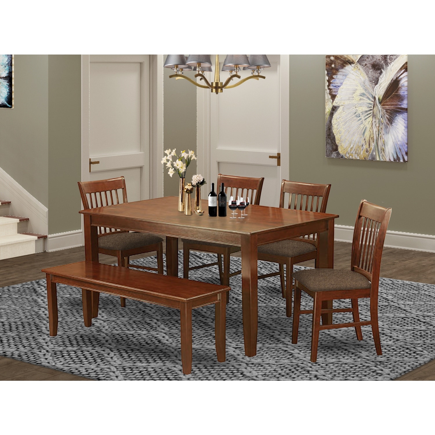 Kitchen Dining Set 6 Piece - Rectangle Table, 4 Chairs & Bench - Mahogany Finish