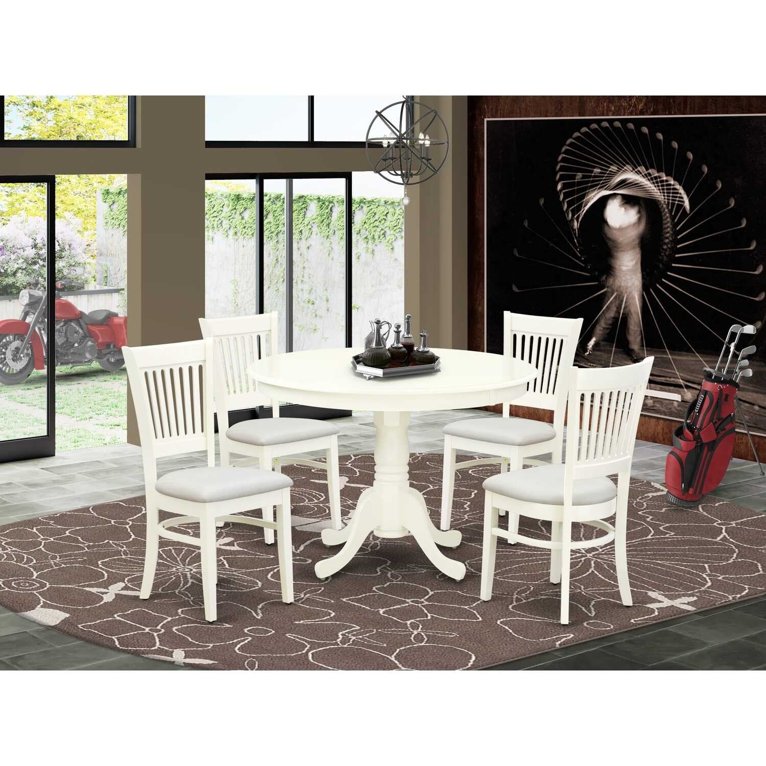 HomeStock 5-Piece Linen White Finish Solid Wood Top Dining table with 4 Chairs with Slat Back