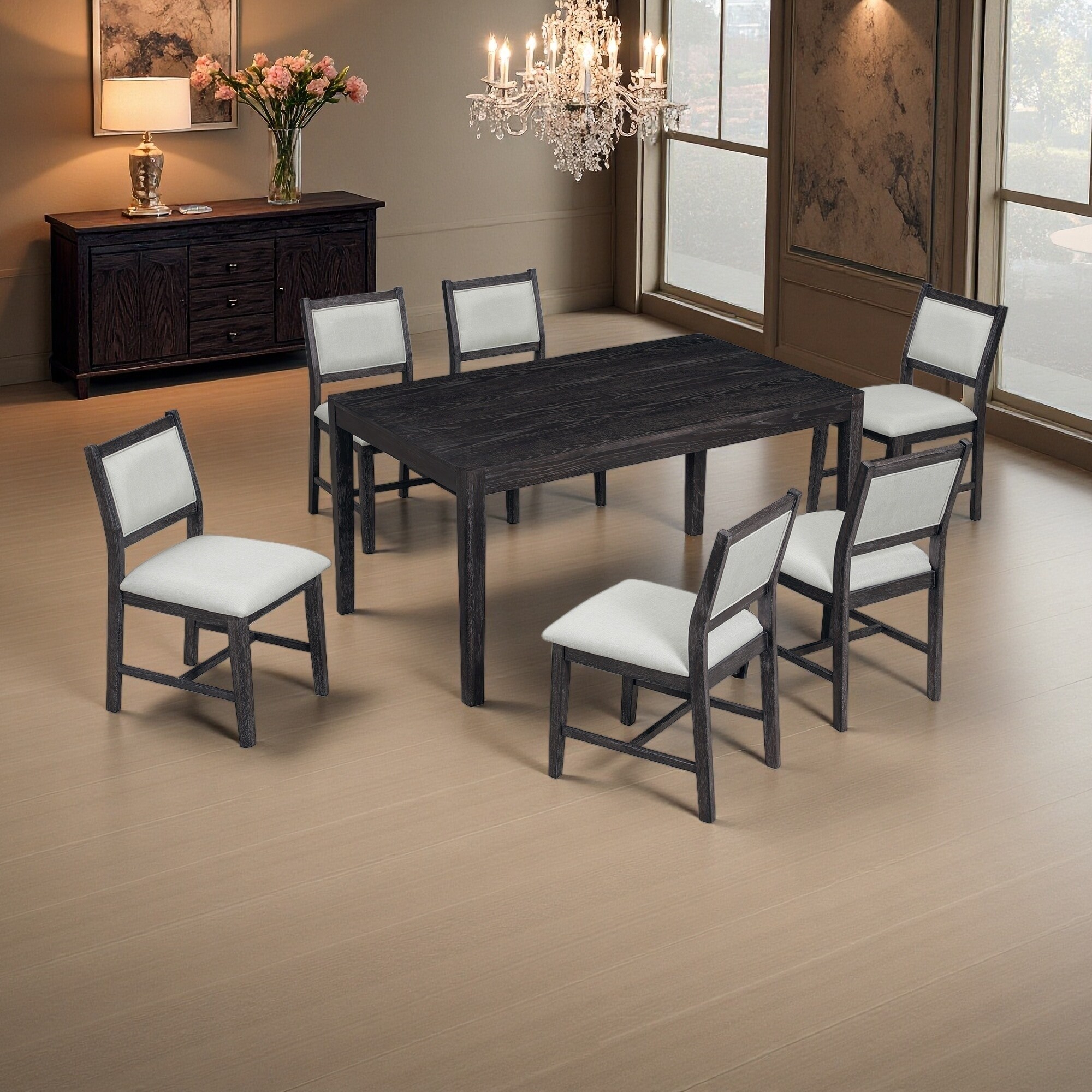 7-Piece Retro Rectangular Wood Dining Table Set with 6 Upholstered Chairs for Dining Room and Kitchen