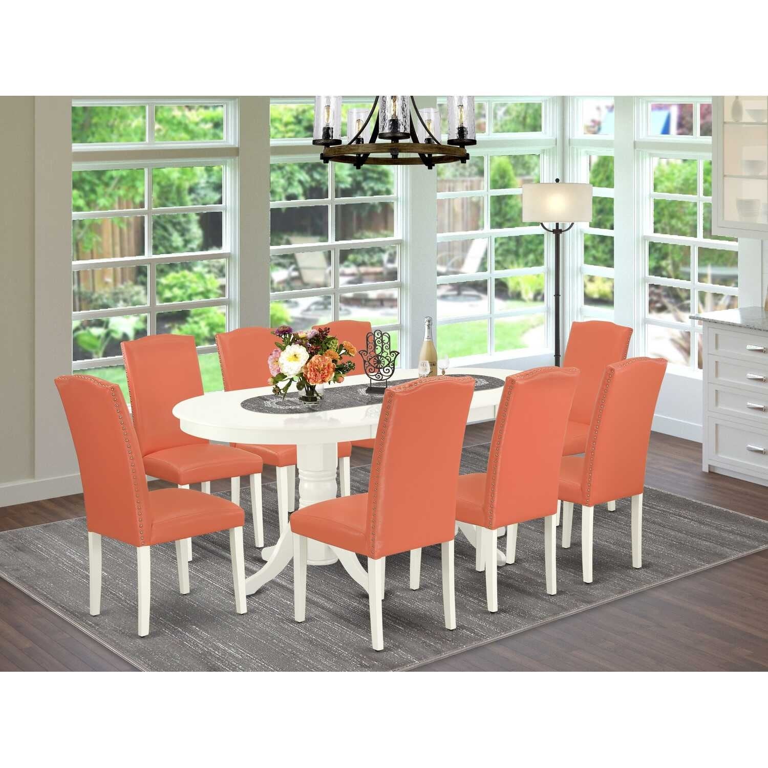 Modern Kitchen Dining Set - 9 Piece Table with Leaf & 8 Chairs - Pink Flamingo Linen White Legs