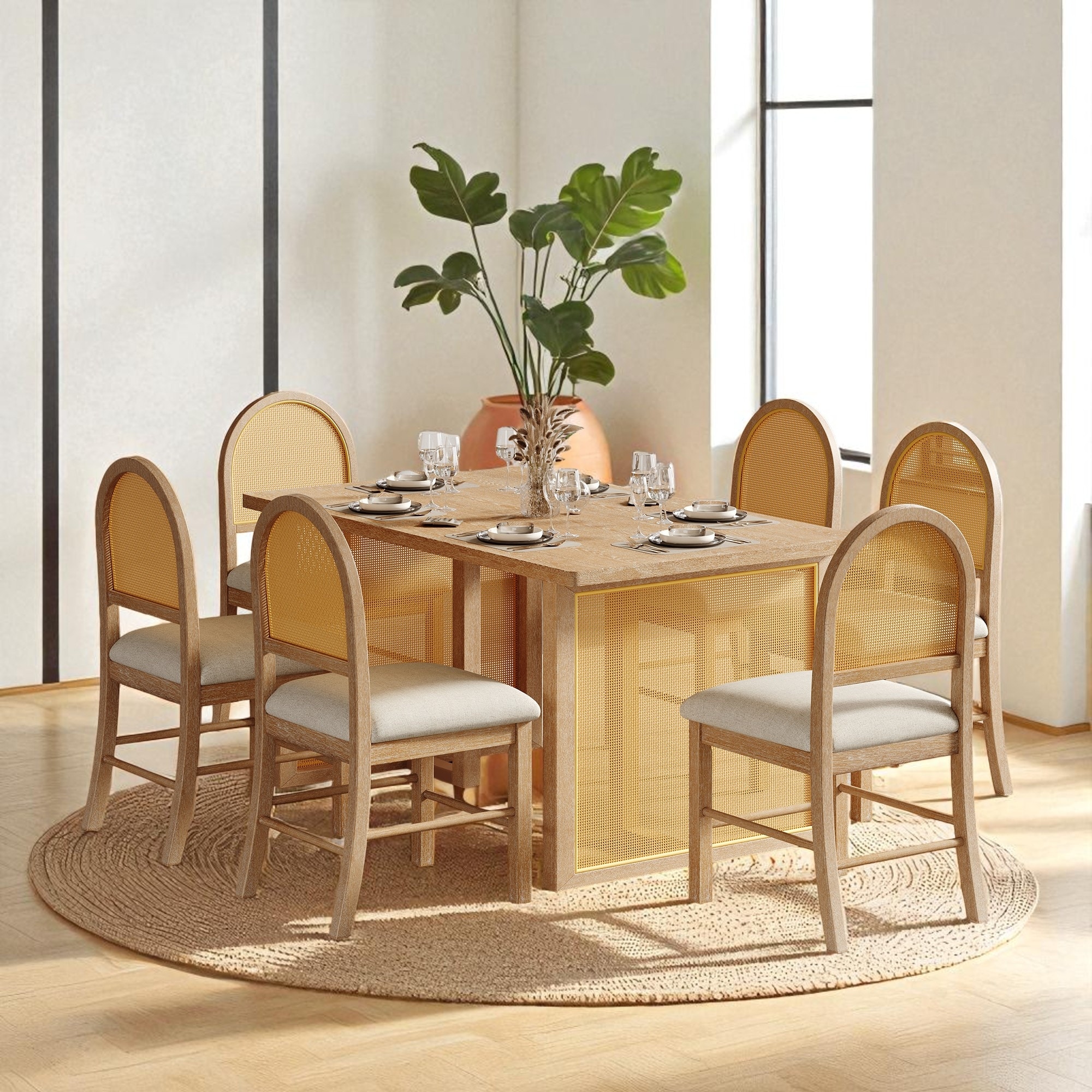 7-Piece Dining Table Set with 59.8" Distressed Oak Veneer Table and 6 Upholstered Rattan Back Chairs, Rustic Kitchen Furniture