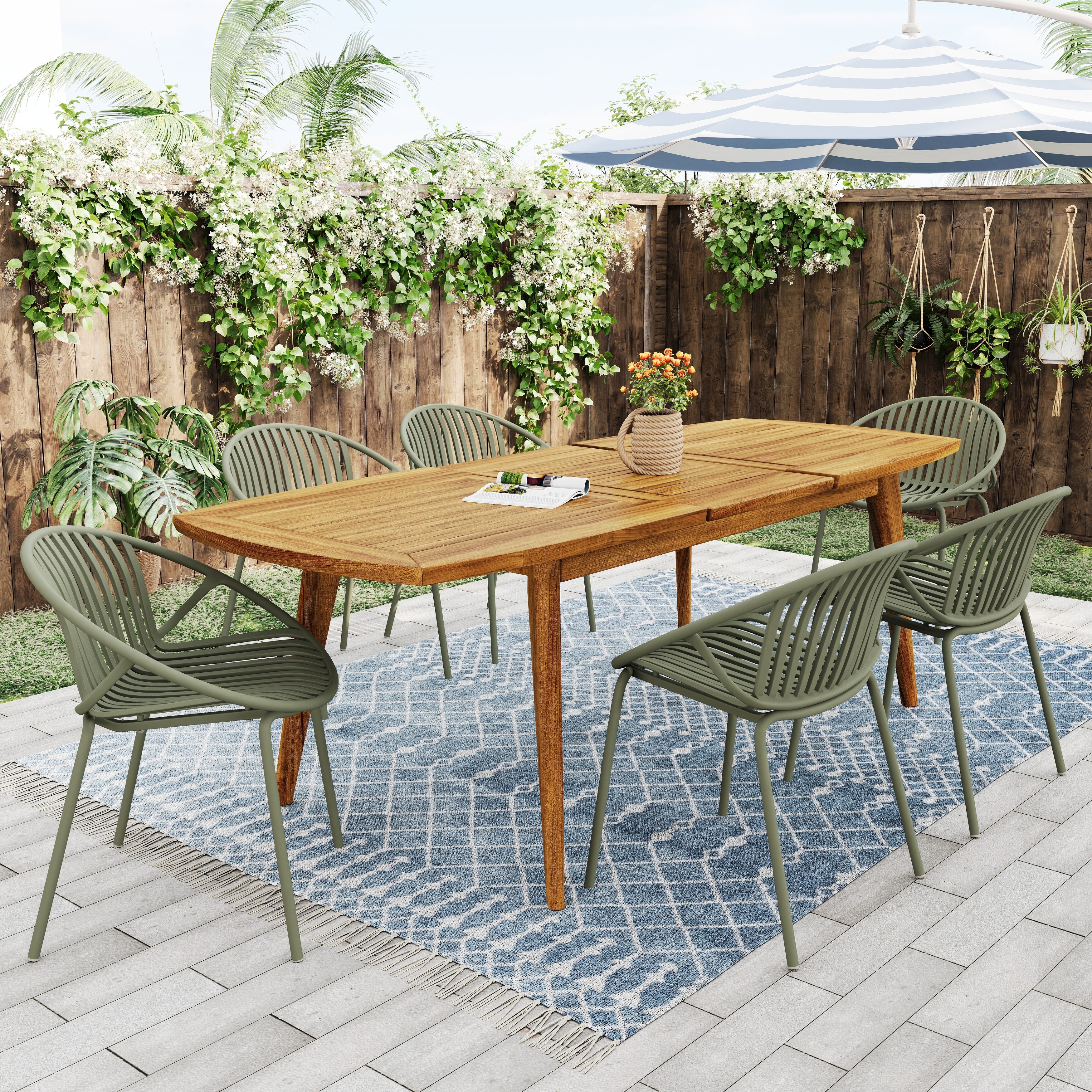 7-Piece Outdoor Expandable Dining Table Set, Modern Acacia Wood Table with 6 Stackable Chairs & Metal Frame for Patio, Backyard