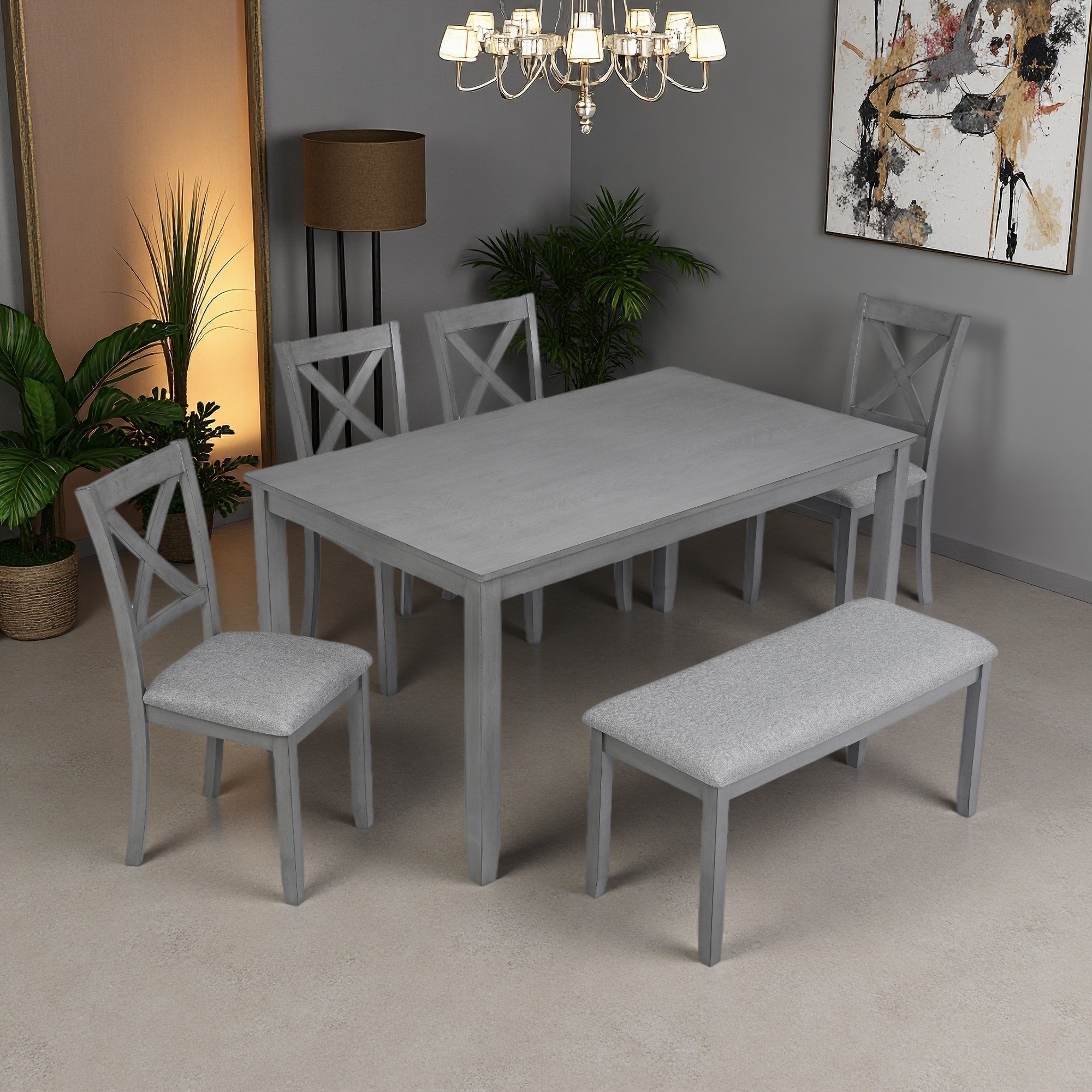 6-piece Retro Dining Set with Table,4 Upholstered Chair and Bench