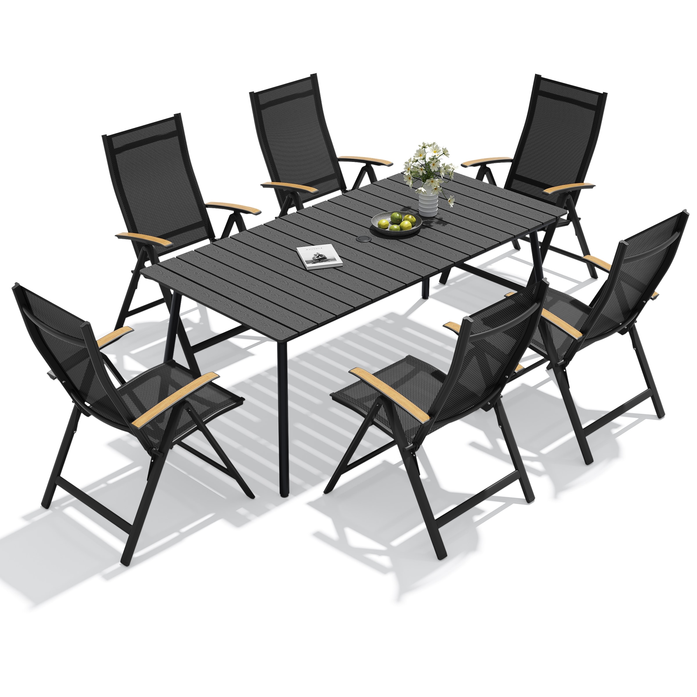 7-Piece Outdoor Patio Dining Set Wood-Like Table Top Aluminum Umbrella Hole Table with Folding Armrest Chairs