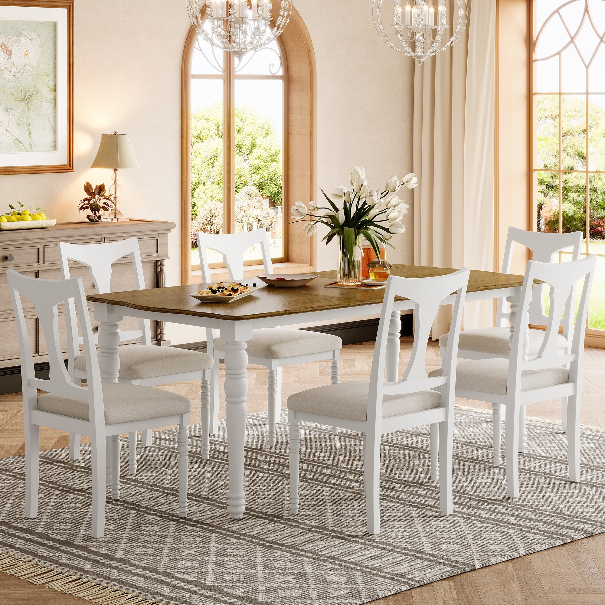 7-Piece Extendable Dining Table Set, Wood Table with Removable Leaf, Kitchen Dining Set with 6 Upholstered Chairs