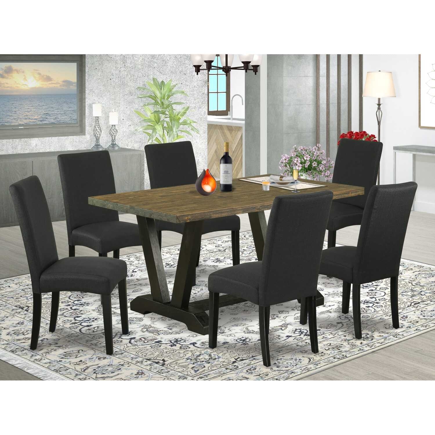 HomeStock 5-Piece Distressed Jacobean Finish Solid Wood Top Dining Table with 4 Parson Chair