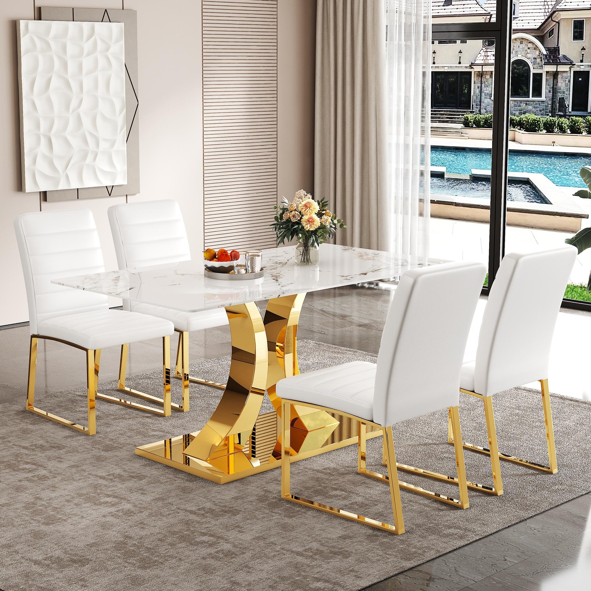 5-Piece Marble Pattern Tempered Glass Dining Set, 63-Inch Table with 4 Minimalist Chairs, Modern Style