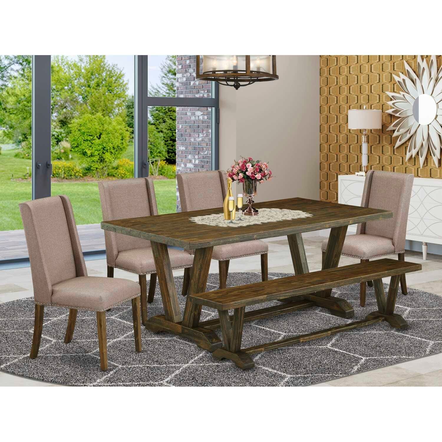 Modern 6-Piece Dining Set - Linen Fabric Chairs, Bench & Rectangular Table