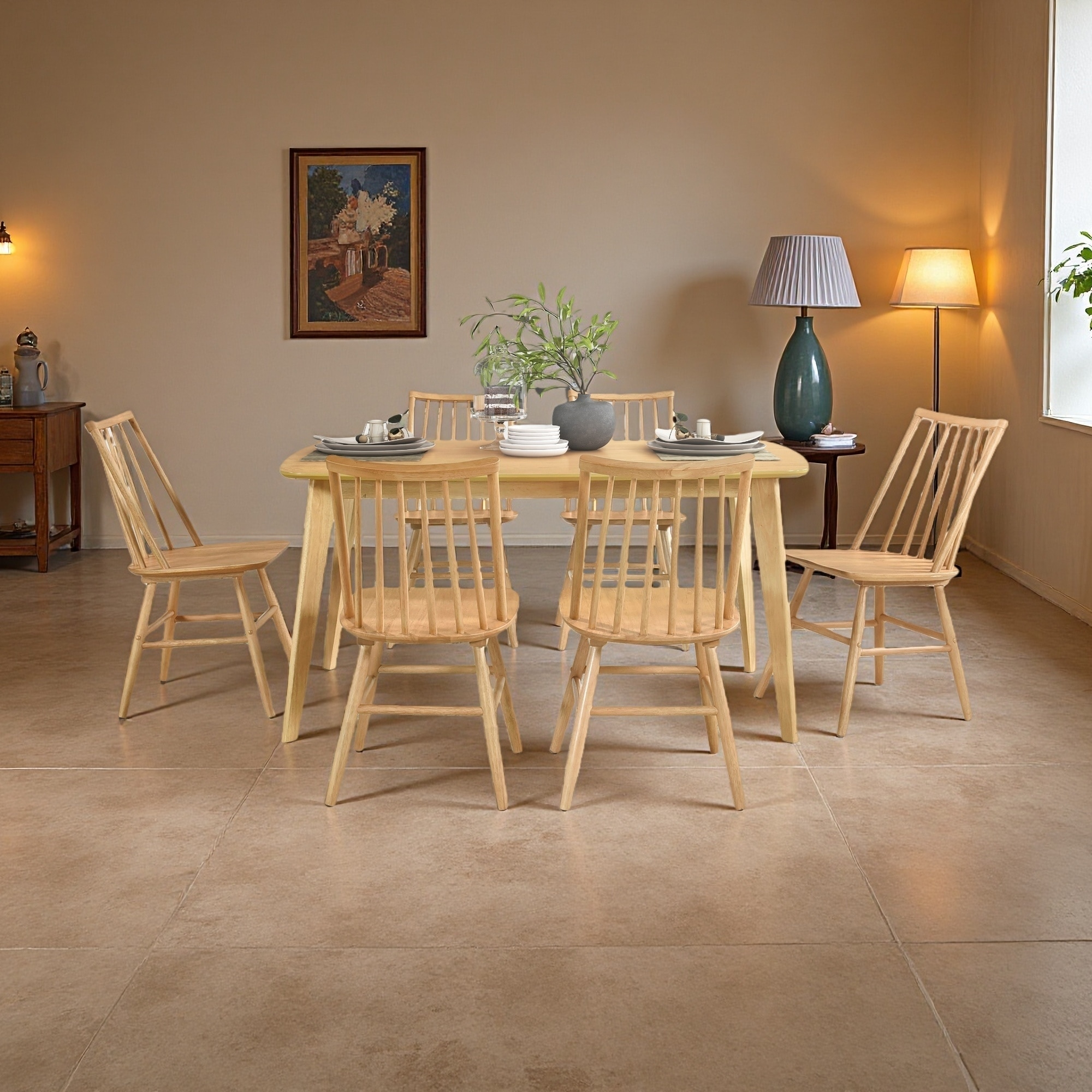 Set of 7 Natural Oak Finish 59.5"L Dining Set, Ash Veneer & Wood with Curved Backrest Chair Windsor Wooden Dining Table & Chairs