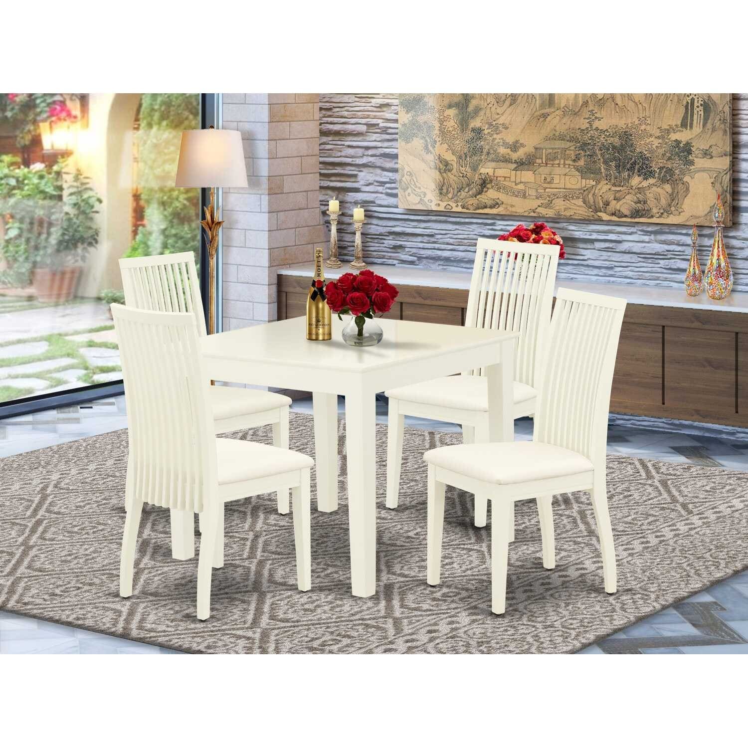 5-Piece Linen White Finish Solid Wood Top - Square Dining Room Set - Seats 4