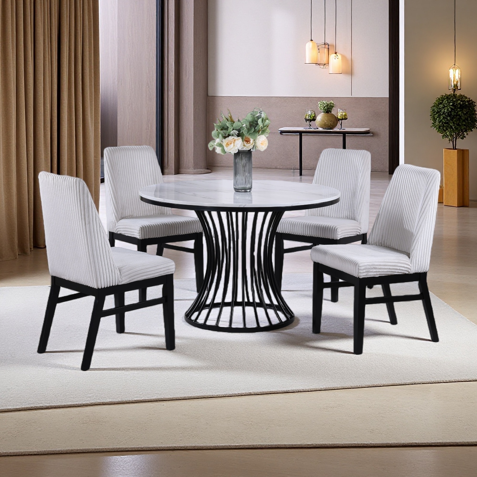 5-Piece Round 47.5" Dining Set with Faux Marble Top & Fabric Upholstered Chairs