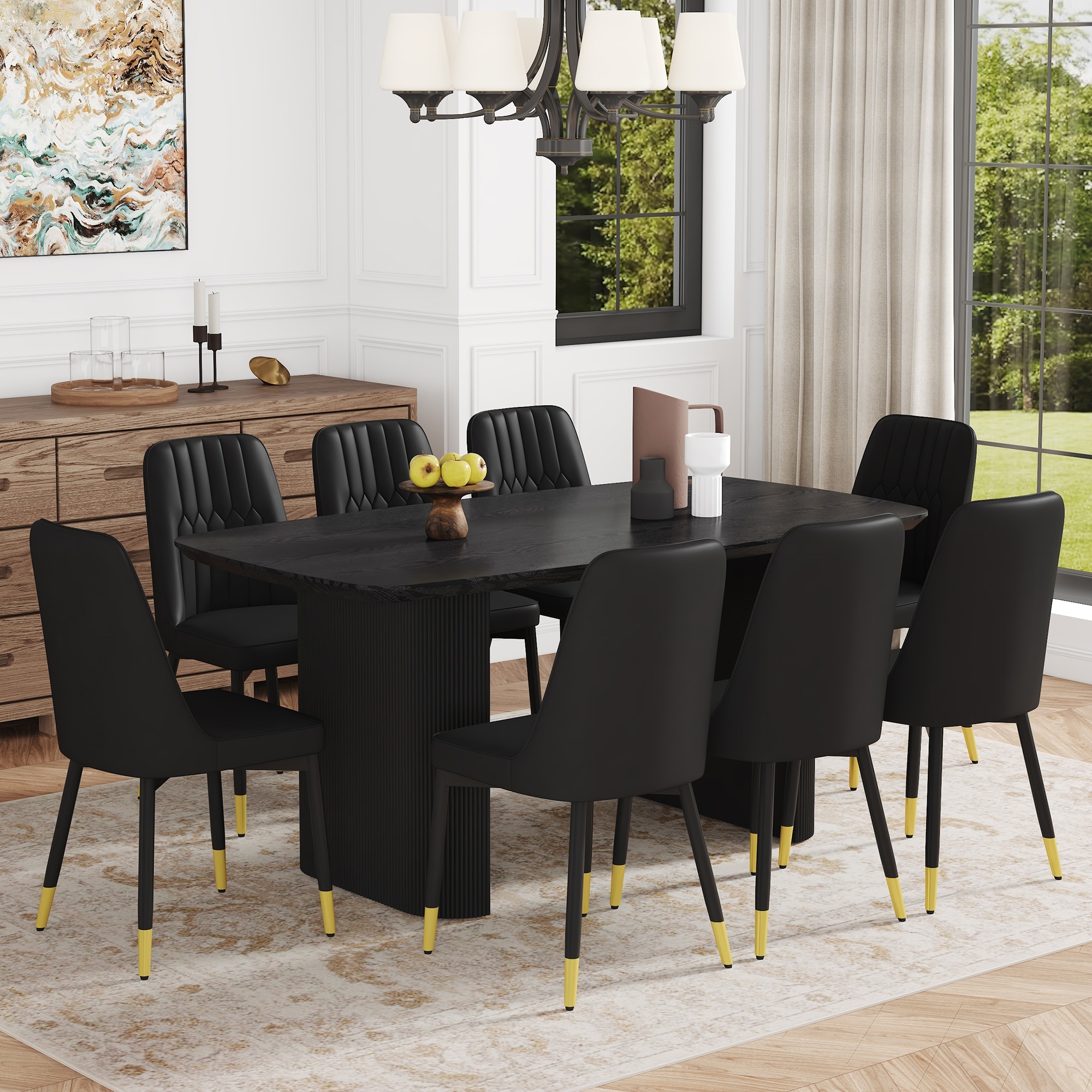 9-Piece Compact Dining Table Chair Set with Wavy Table Leg, MDF Rectangular Dining Table Set with 8 Upholstered Dining Chair