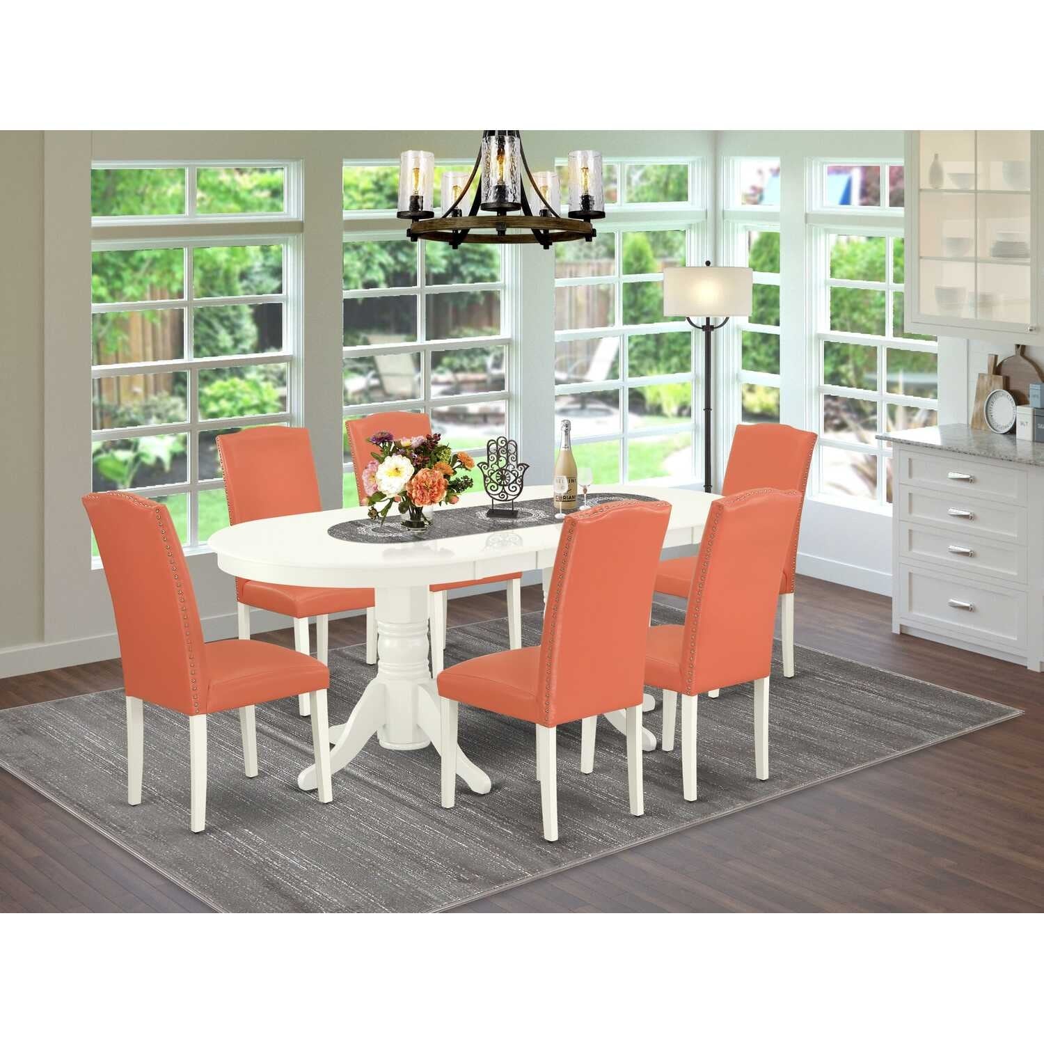 Dining Room Set 7Pc Table & Chairs Pink Flamingo Linen White Legs Modern Design