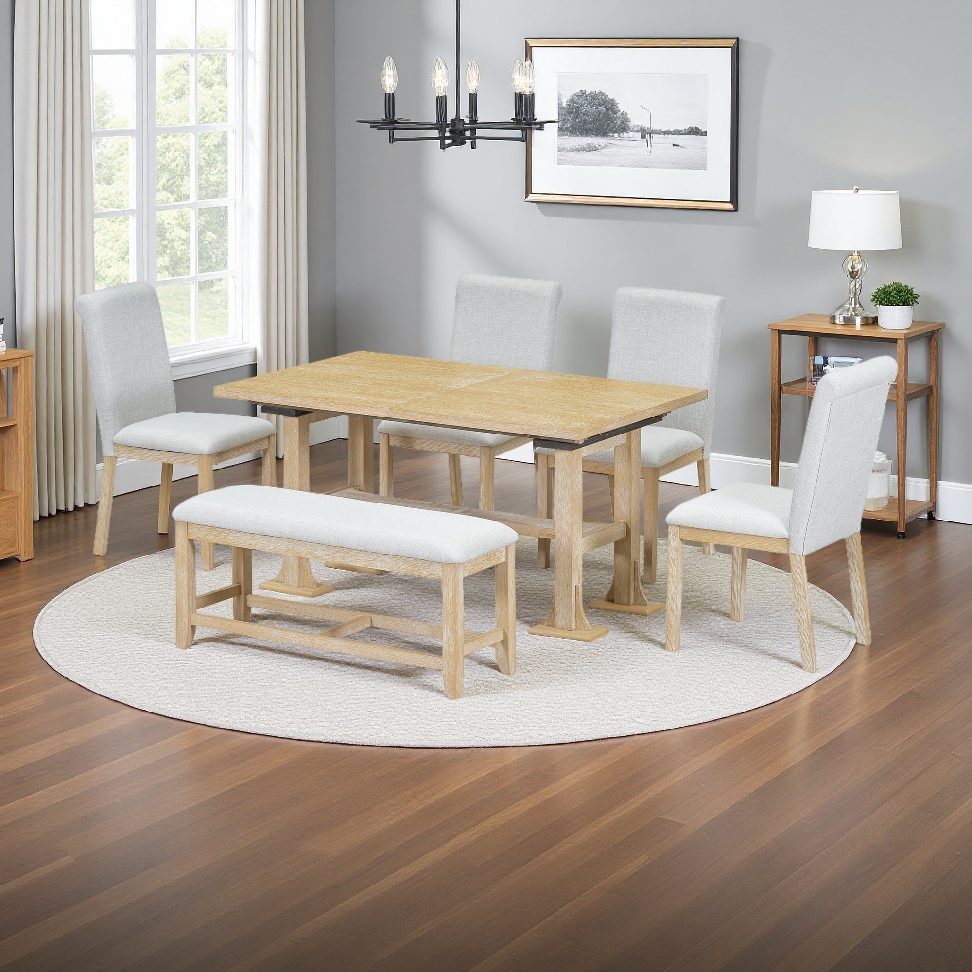 Farmhouse 6-Piece Extendable Dining Set, 76" Trestle Table with 18" Removable Leaf, Upholstered Chairs & Bench for Dining Room