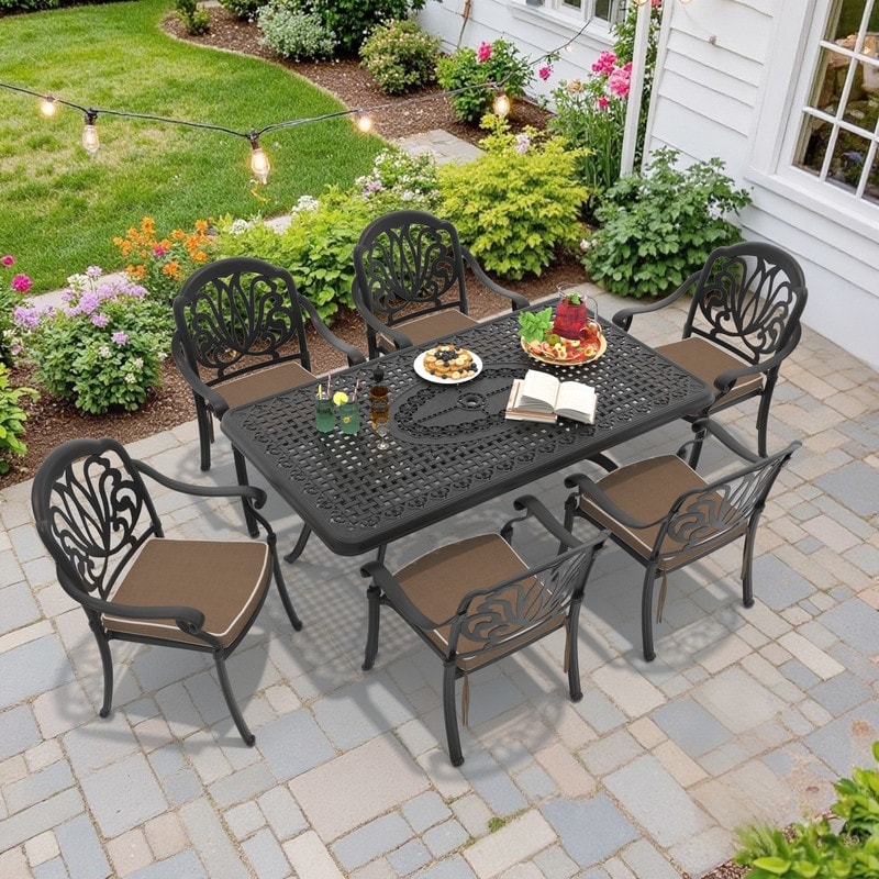 7-Piece Cast Aluminum Outdoor Dining Set with Brown Seat Cushions
