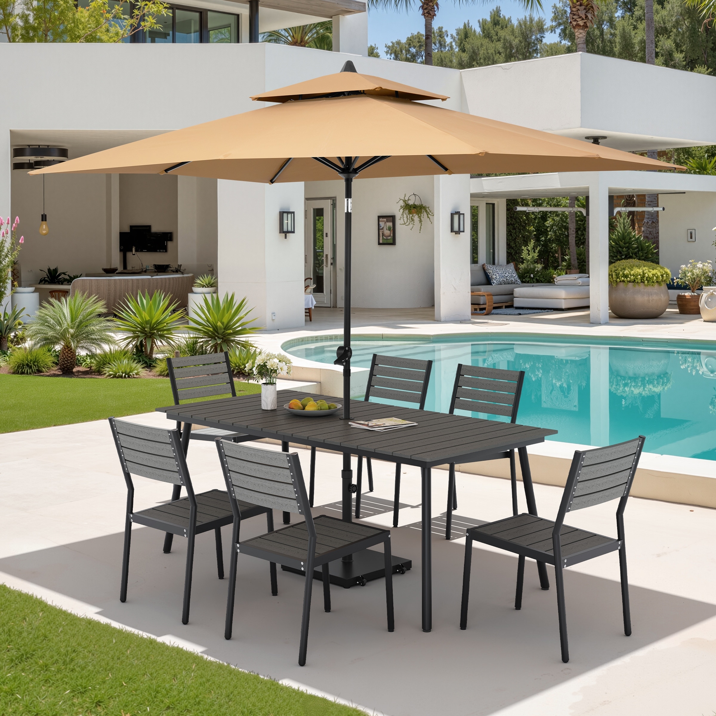 9PC Outdoor Patio Dining Set Wood-Like Aluminum Table with Stackable Chairs,Double Top Market Umbrella and Wheel Base