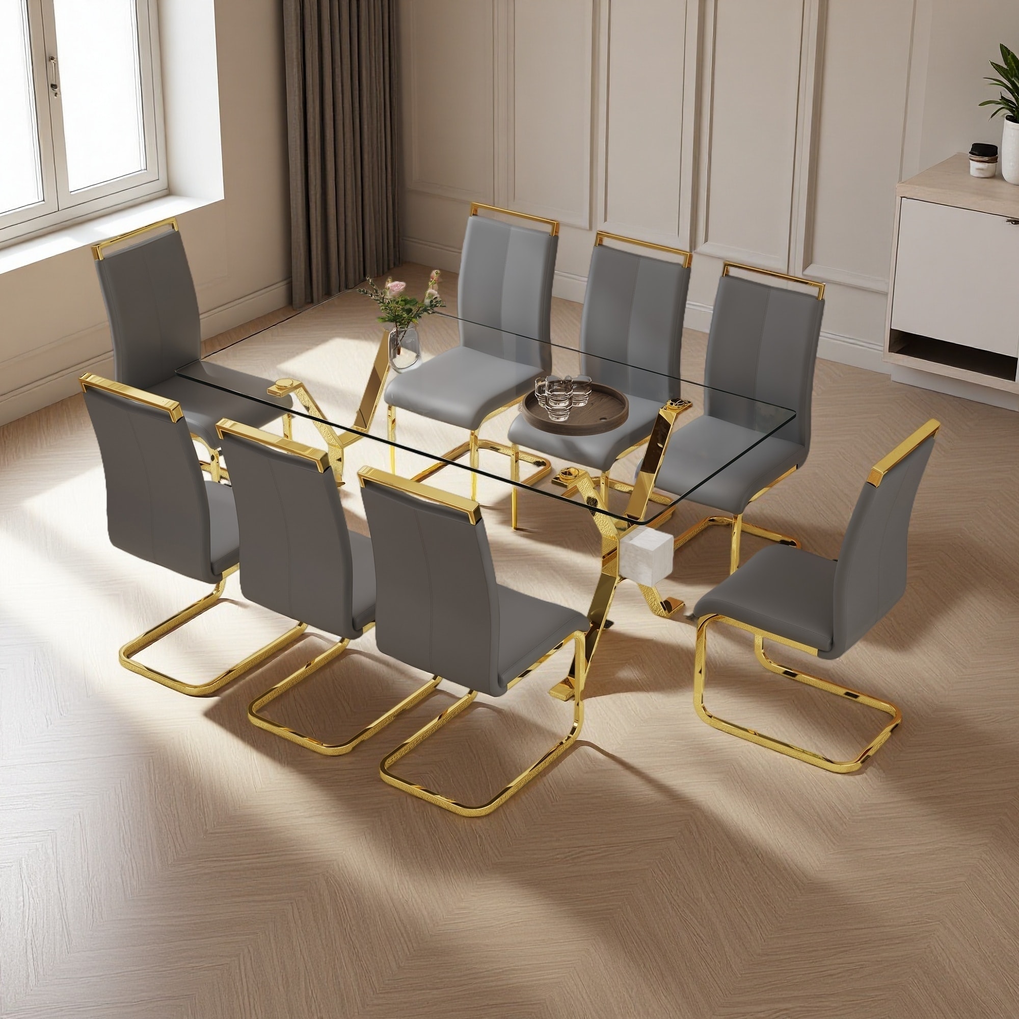 71"x35.4" Elegant Transparent Tempered Glass Dining Table Set with 8 PU Chairs and C-Tube Metal Legs