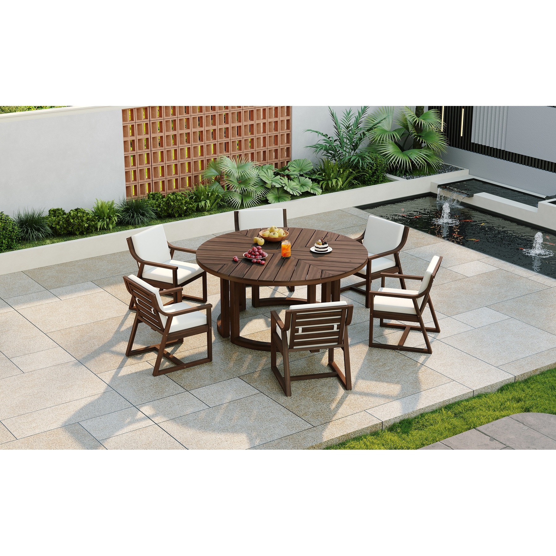Round Patio Dining Table Set for 6 with Umbrella Hole Durable Acacia Wood Outdoor Furniture