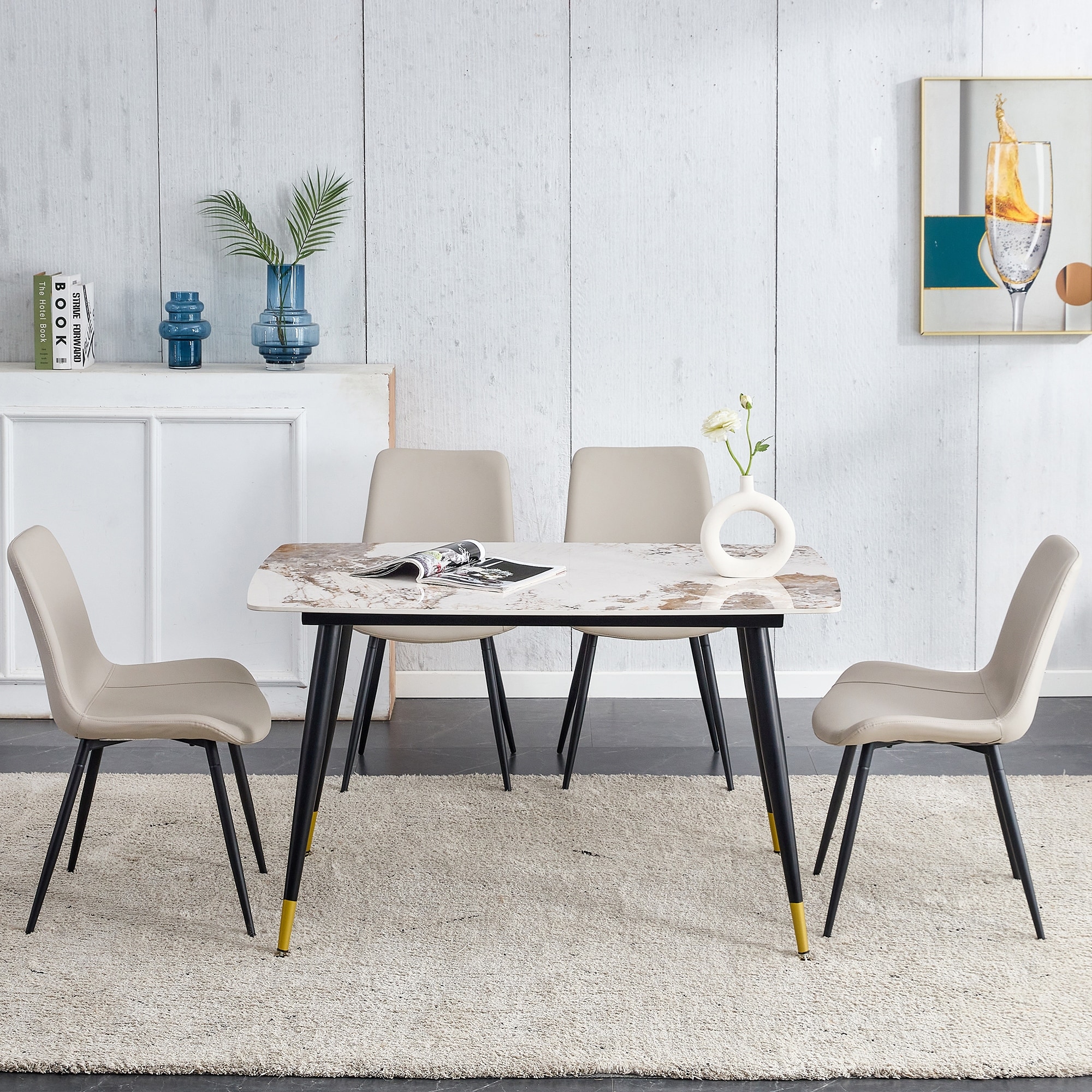 48.4" 5-Piece Sintered Stone Dining Table Set with 4 PU Chairs, Curved Widened Cushions, Pandora Patterned Rock Slab Desktop