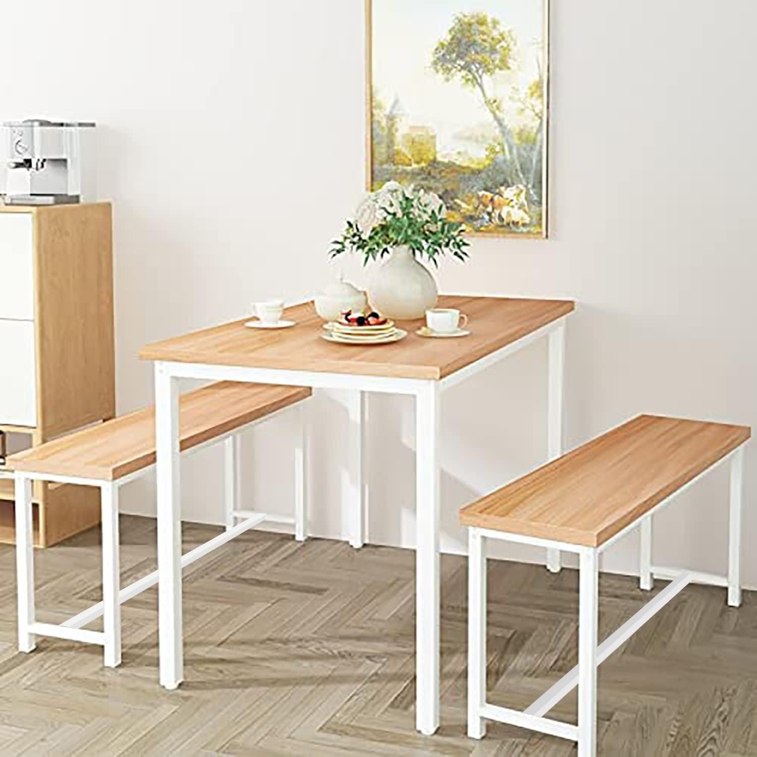 Compact 4-Person Wooden Dining Set with Metal Frame, Space-Saving Table & 2 Benches for Small Kitchen/Breakfast Nook