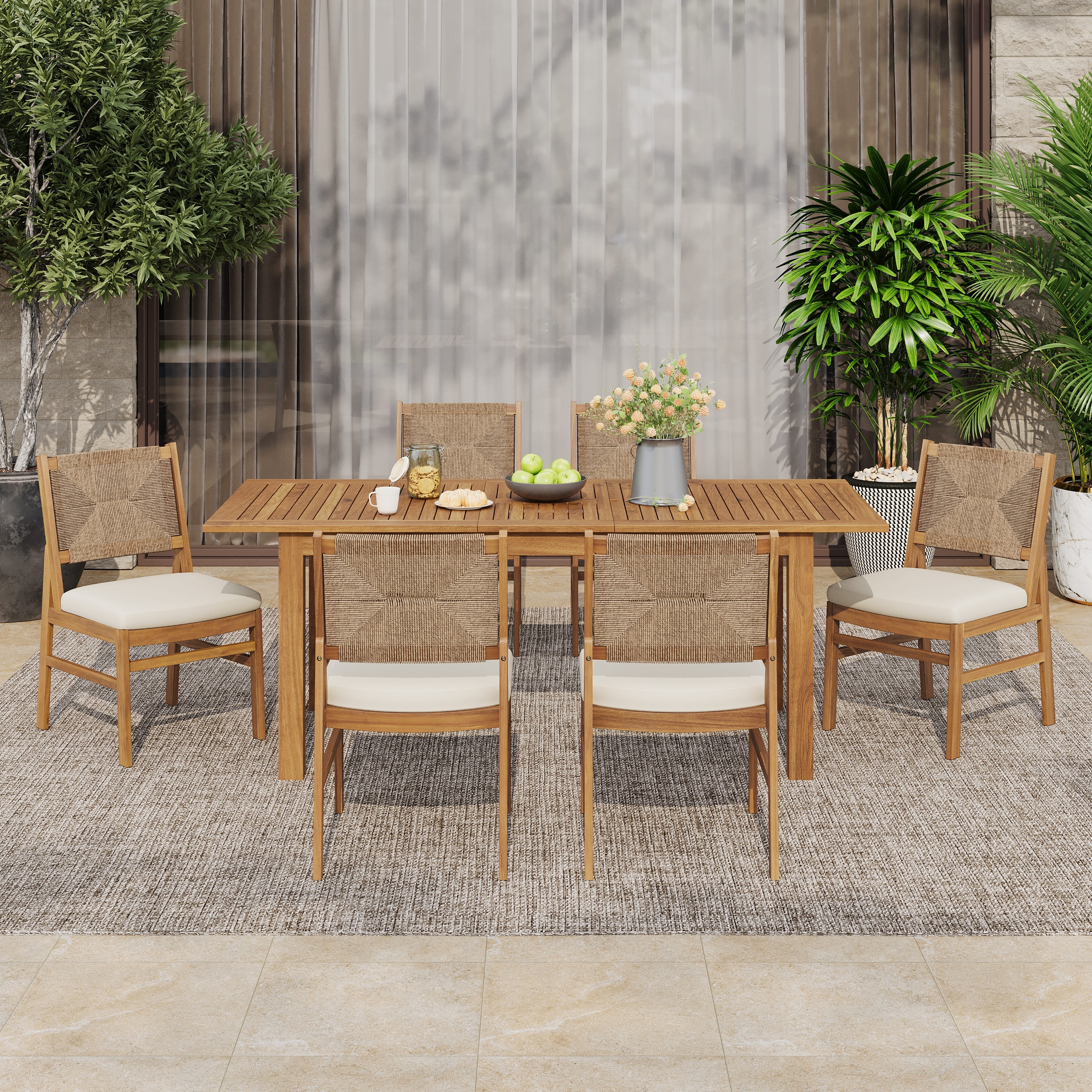 Christopher Knight Home - Elysande Outdoor Acacia Wood 7 Piece Dining Set with Rattan Legs and Water Resistant Cushions