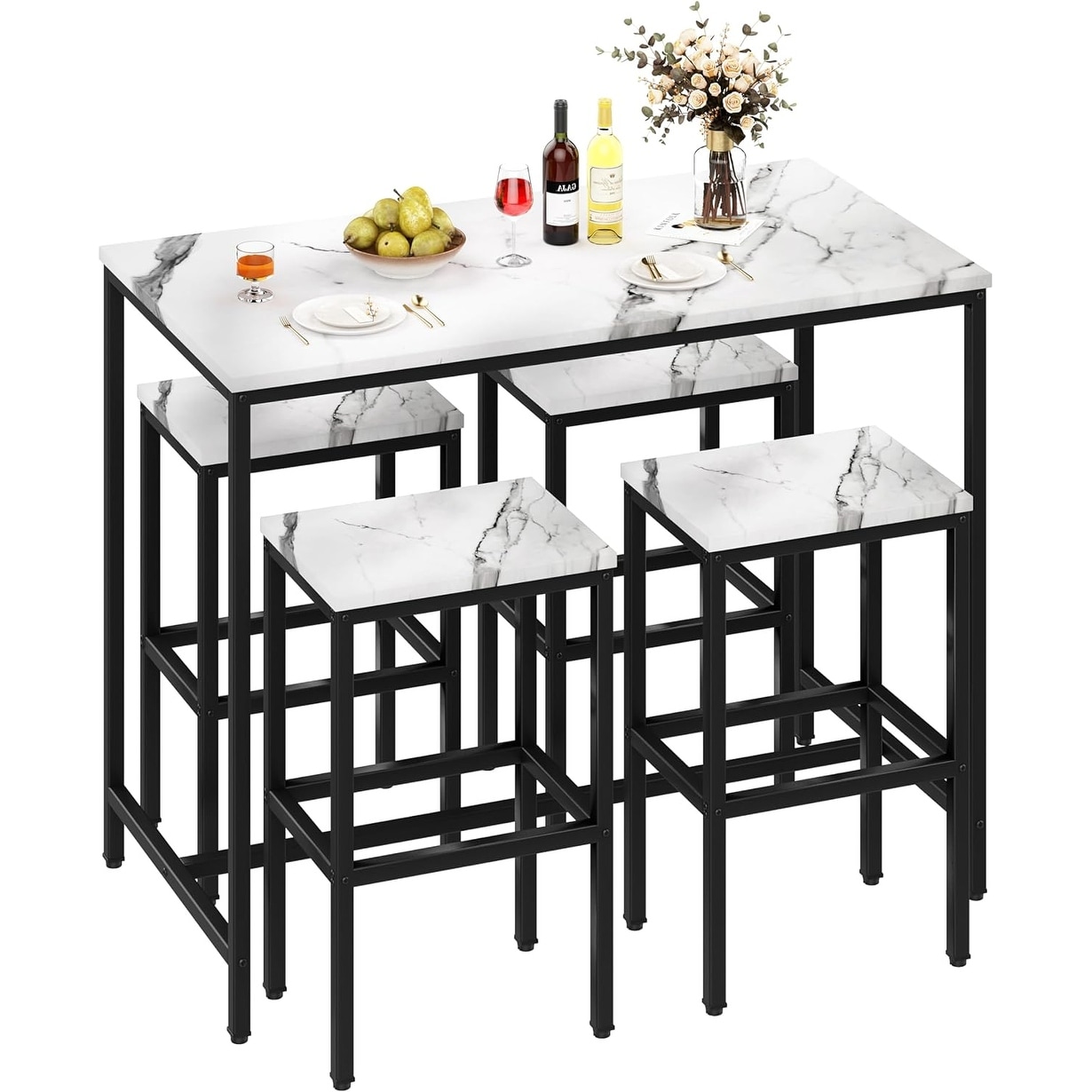 Modern 5-Piece Bar Table Set with Stools, White Faux Marble Wood Top, Counter Height for Kitchen, Dining Room, Living Room