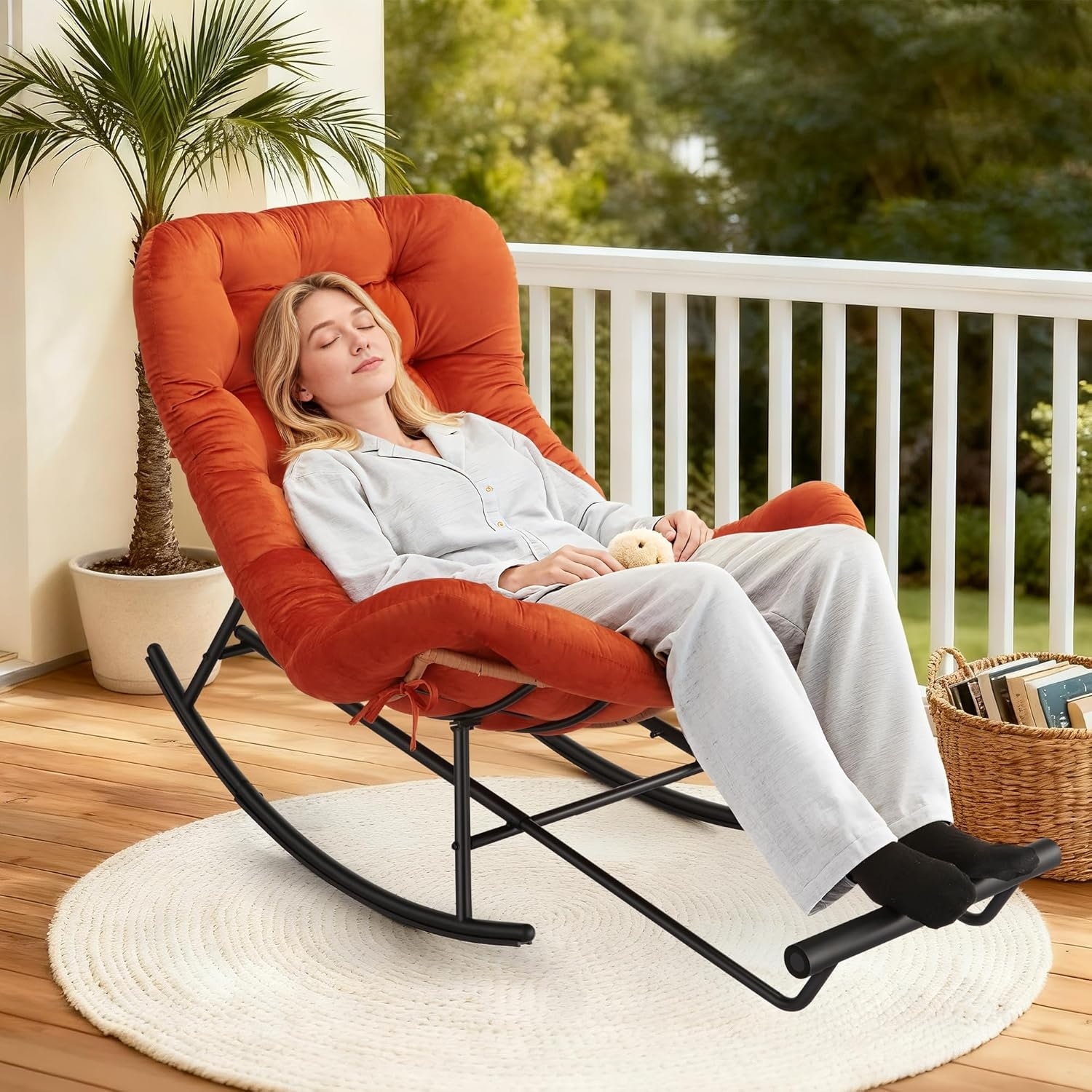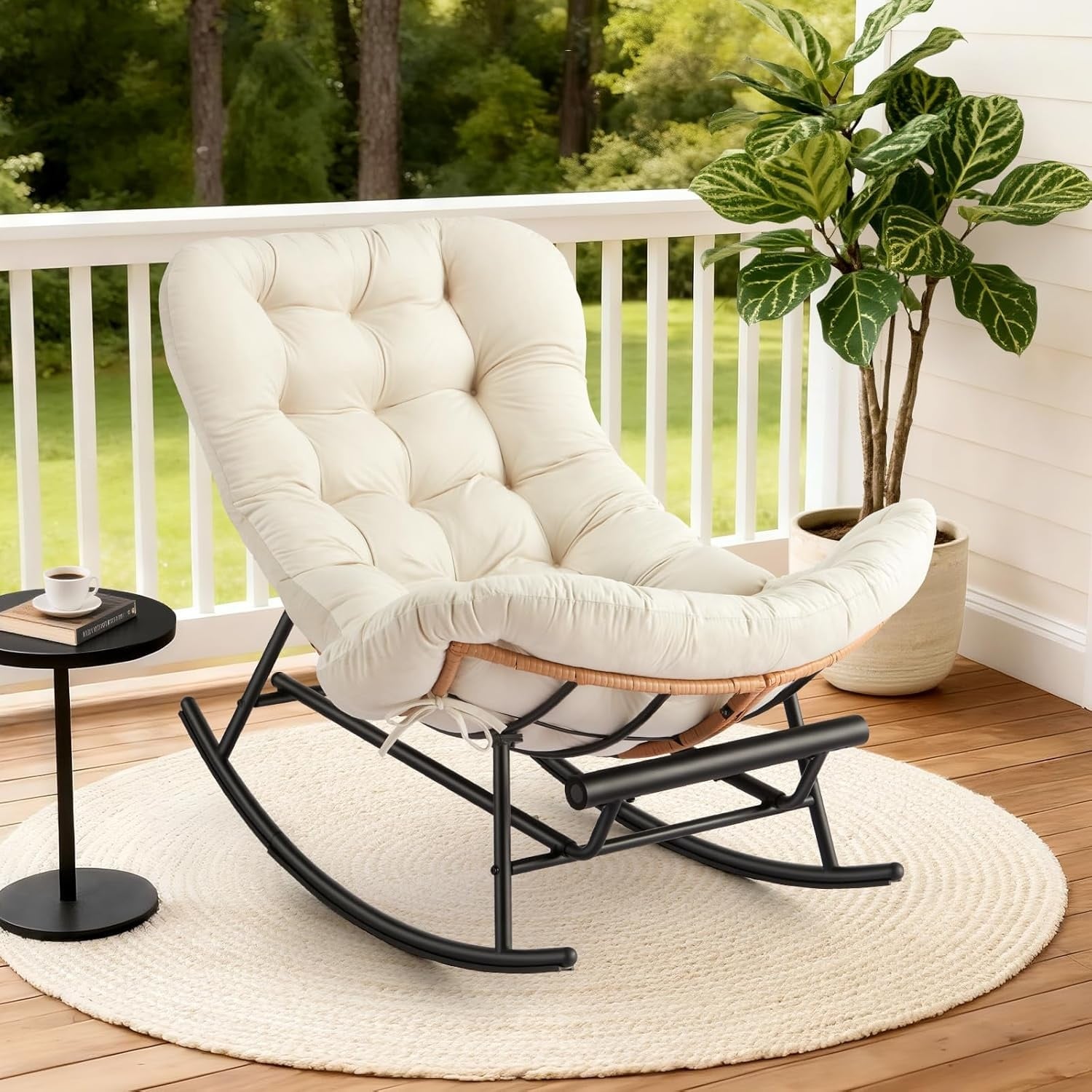Oversized Rattan Rocking Chair with Footstool, Cushion Included, Indoor Outdoor