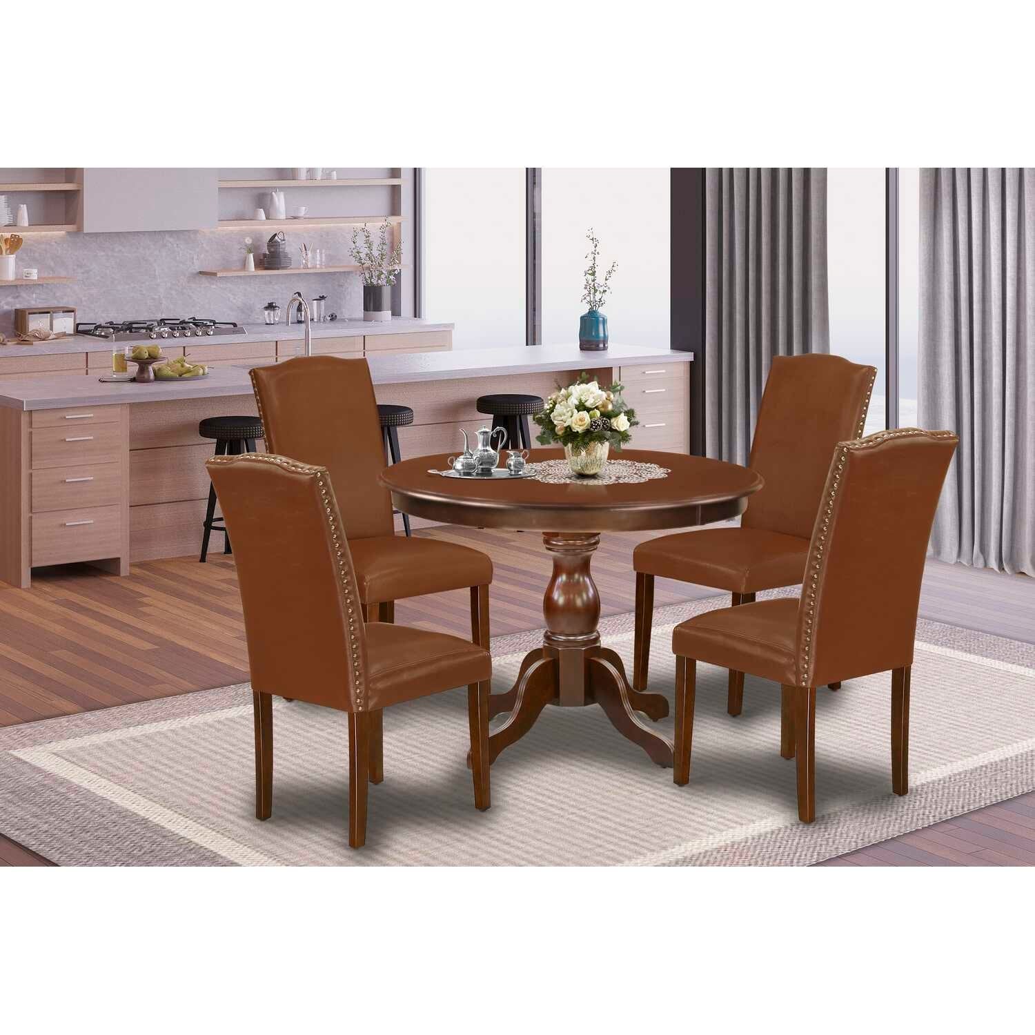 5-Piece Round Mahogany Finish Solid Wood Top Dining Table with 4 Parson Chair with