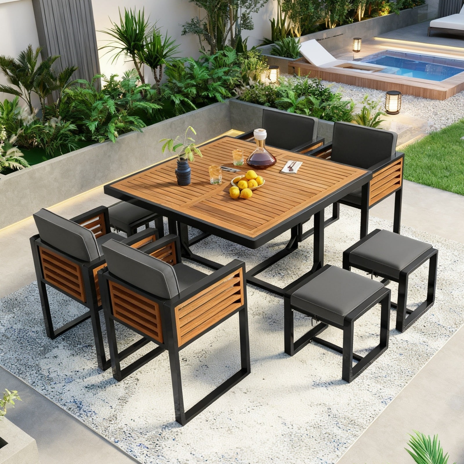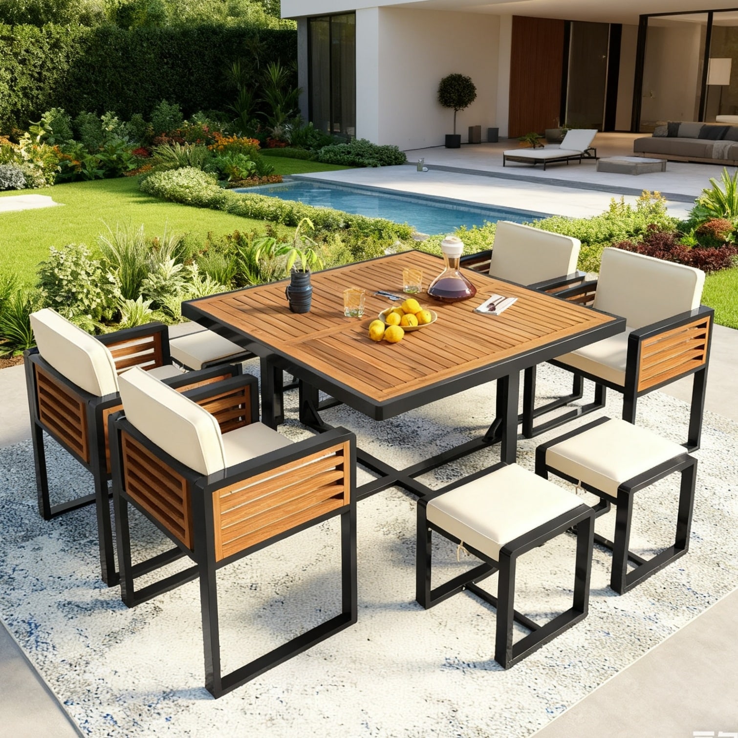 9-Piece Acacia Wood Outdoor Square Dining Set with Chairs and Ottomans