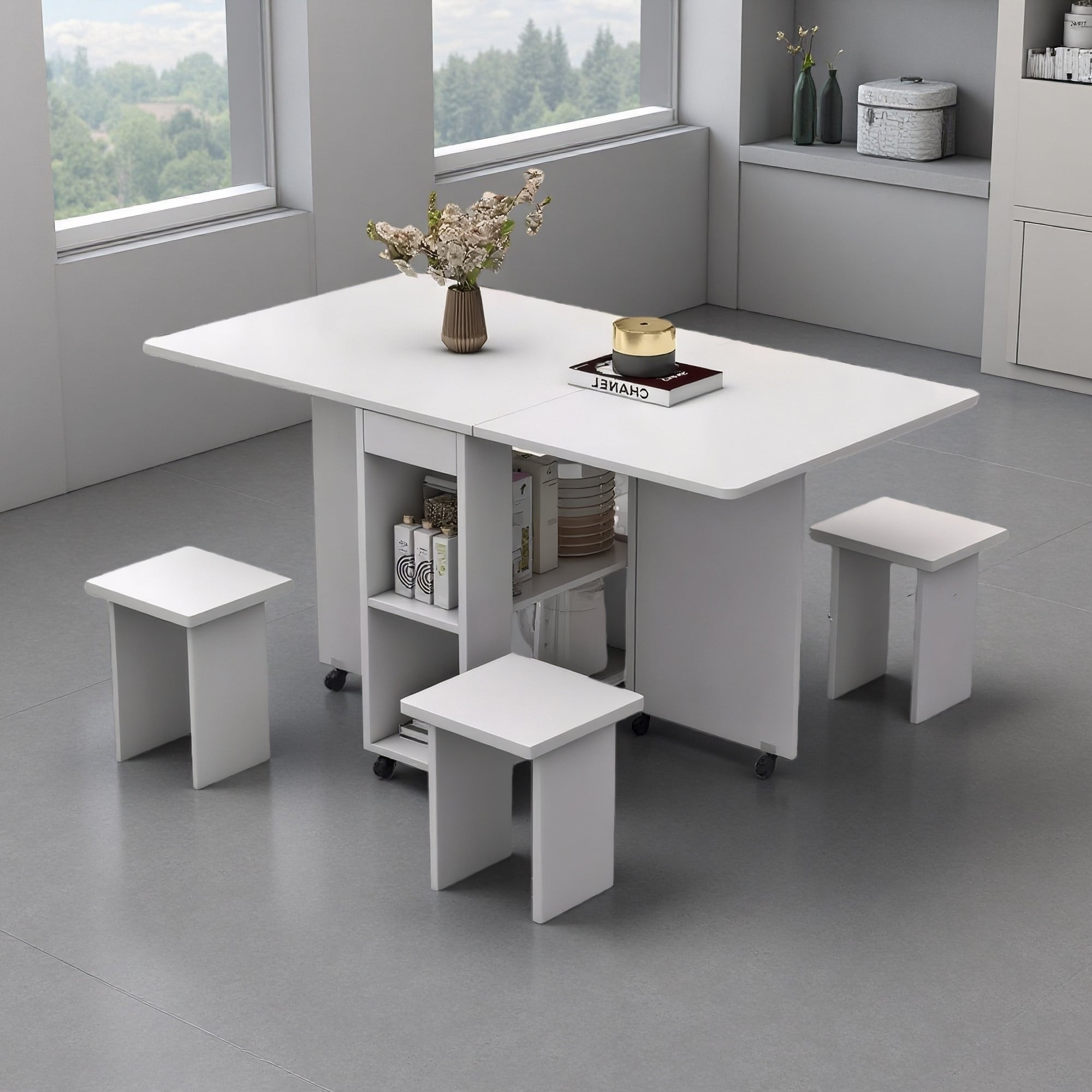 5-Piece 47.2" MDF Folding Drop Leaf Dining Table Set with 4 Chairs, Space-Saving, Storage, 6 Wheels, Flexible