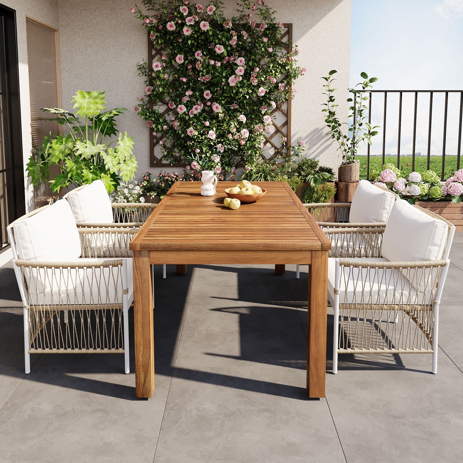 5 Pieces Patio Wooden 67''L Rectangular Dining Table Set with 4 Rattan Arm Chairs