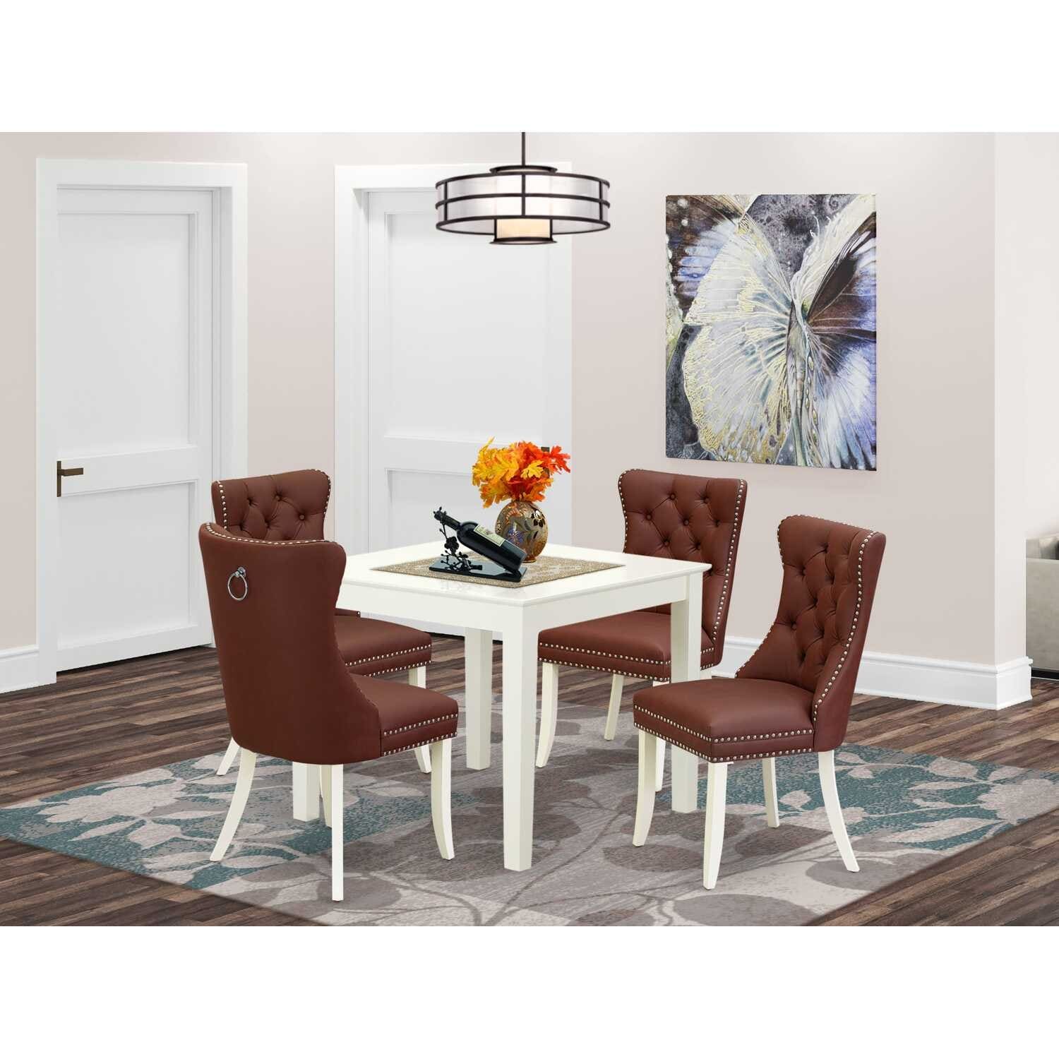 5-Piece Linen White Finish Solid Wood Top - Square Upholstered Dining Room Set - Seats 4