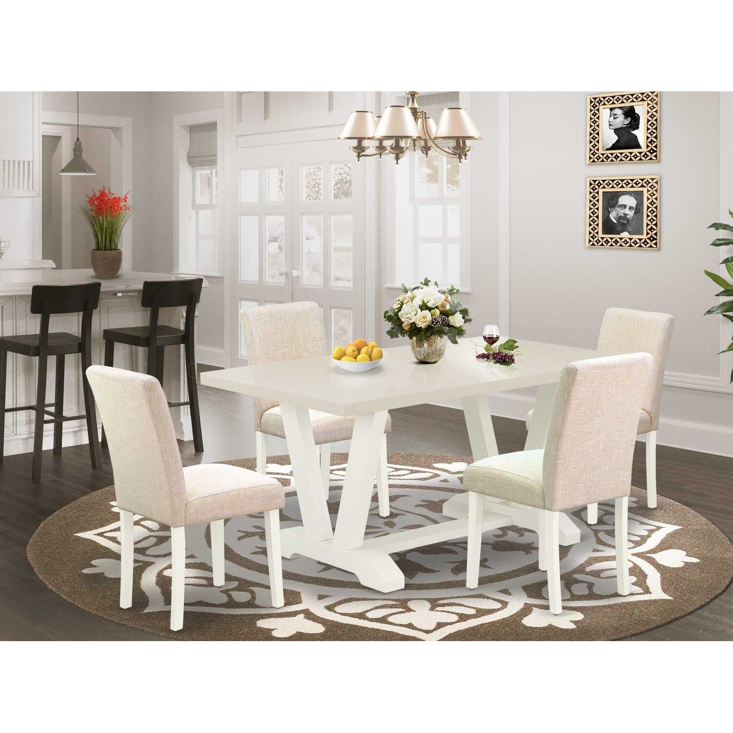 5-Piece Rectangular Linen White Finish Solid Wood Top-Upholstered Dining Room Set-Seats 4