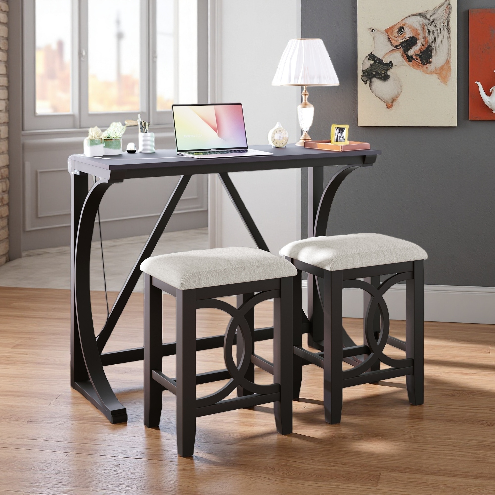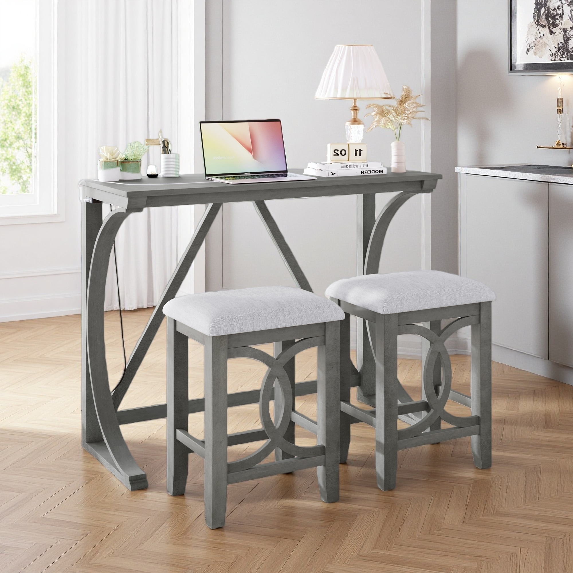 Set of 3 Counter Height 47.2"L Dining Table, MDF & Solid Rubber Wood, USB Port, Space-Saving with 2 Upholstered Stools