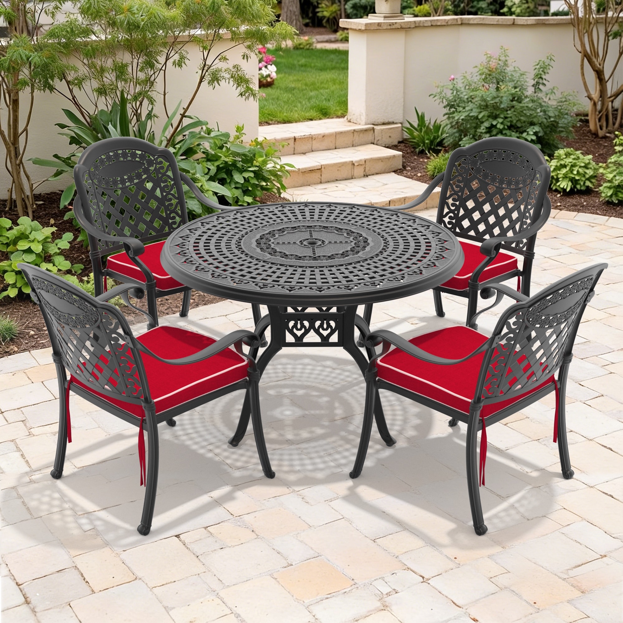 5-Piece Set Of Cast Aluminum Patio Furniture With Red Cushions