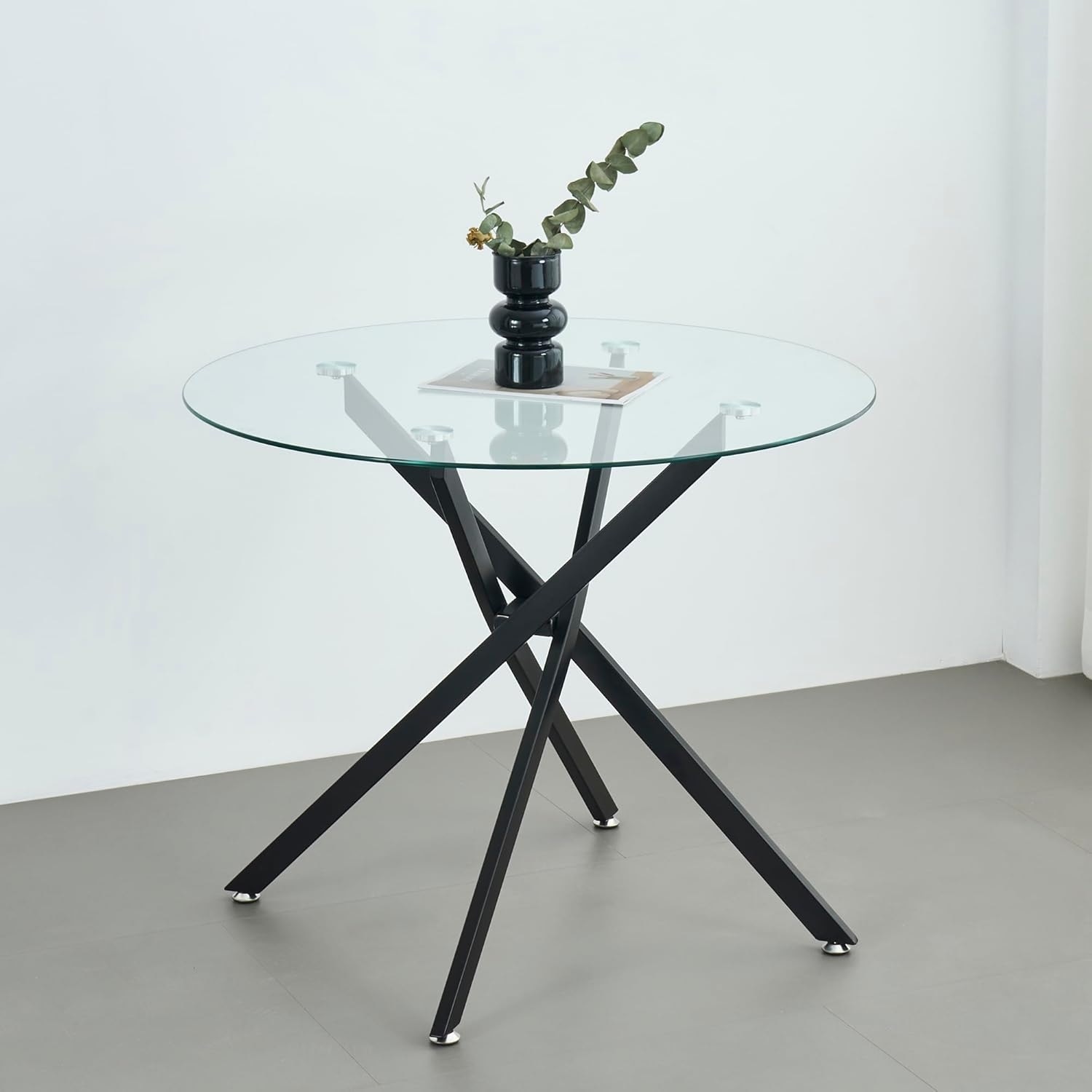 36 Inch Round Tempered Glass Dining Table with Silver X Metal Legs - Black