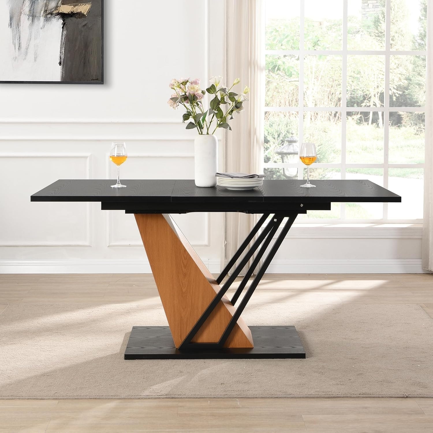 Extendable Modern Kitchen Dining Table, 47 to 62 Inch, Black & Brown, V-Shaped Wooden Metal Base, Seats 4-6 - 62" Black & Brown