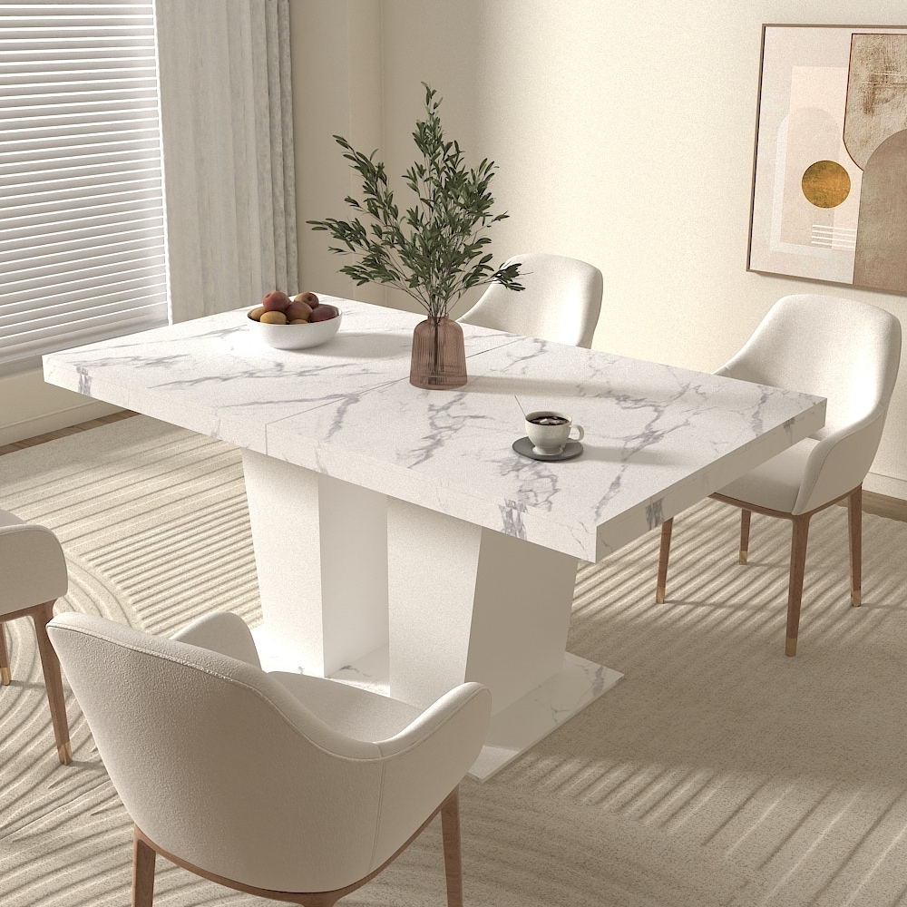 Extendable Dining Room Table for 6-10 Modern White Faux Marble Wooden Expandable Kitchen Table w/Dual Column Pedestal Base, L