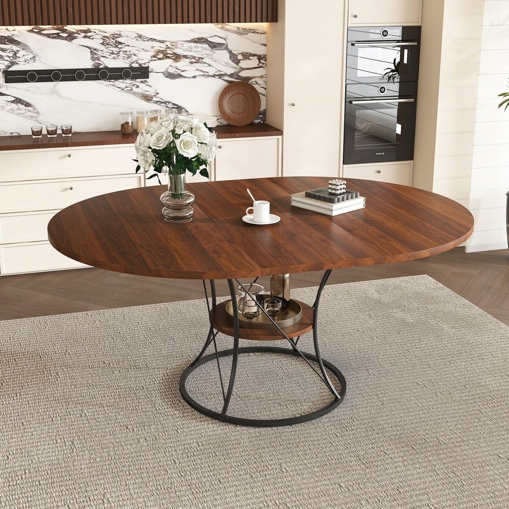 43 to 59 Inch Extendable Round Dining Table for 4-6 - Farmhouse Kitchen Table with Storage Shelf & Metal Base