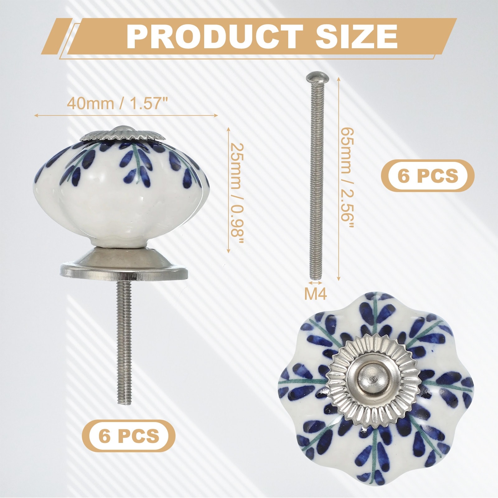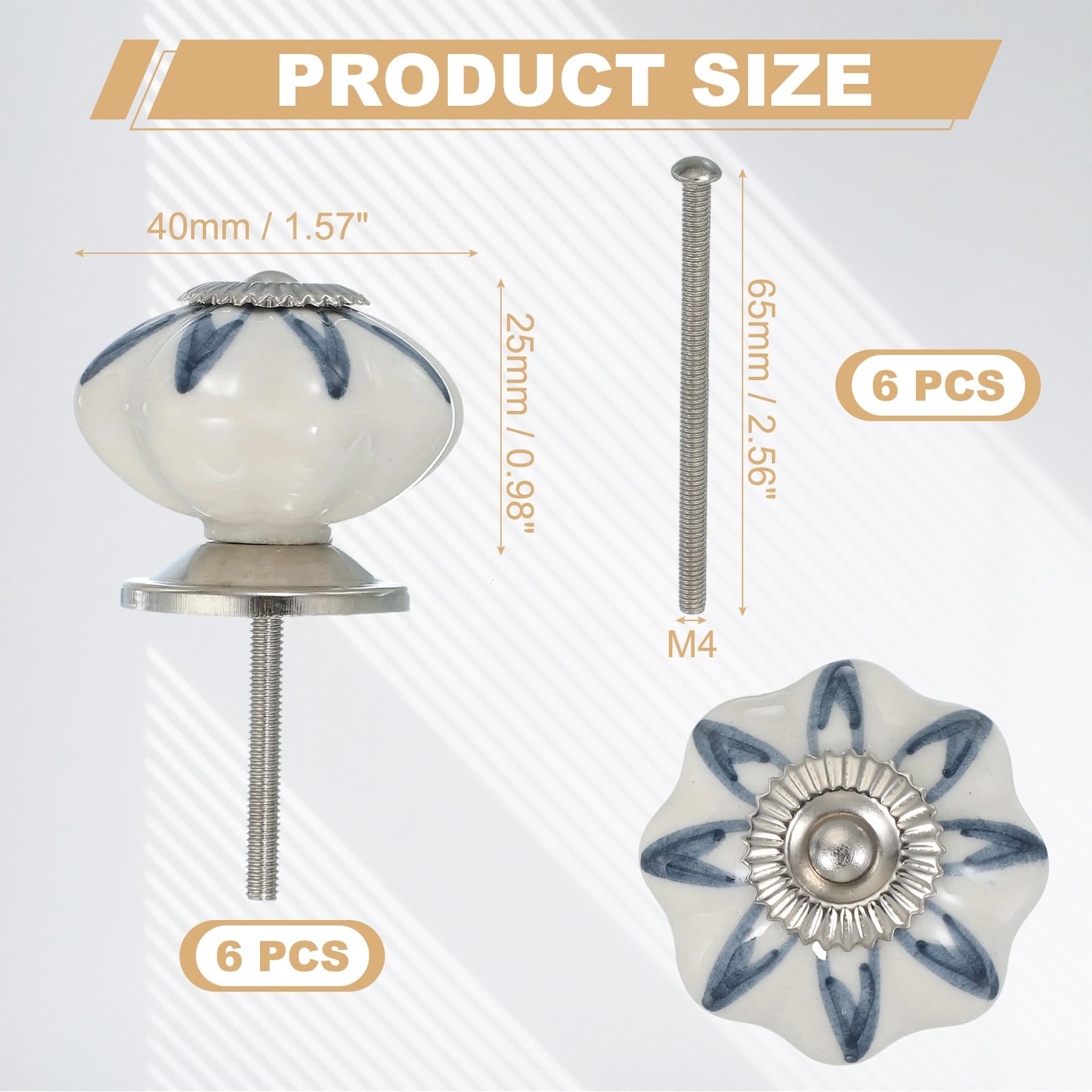 Silver and White Ceramic Floral Knobs Set of 8 with Screws - 1.5” x 1.5” x 1.5” (D x W x H)