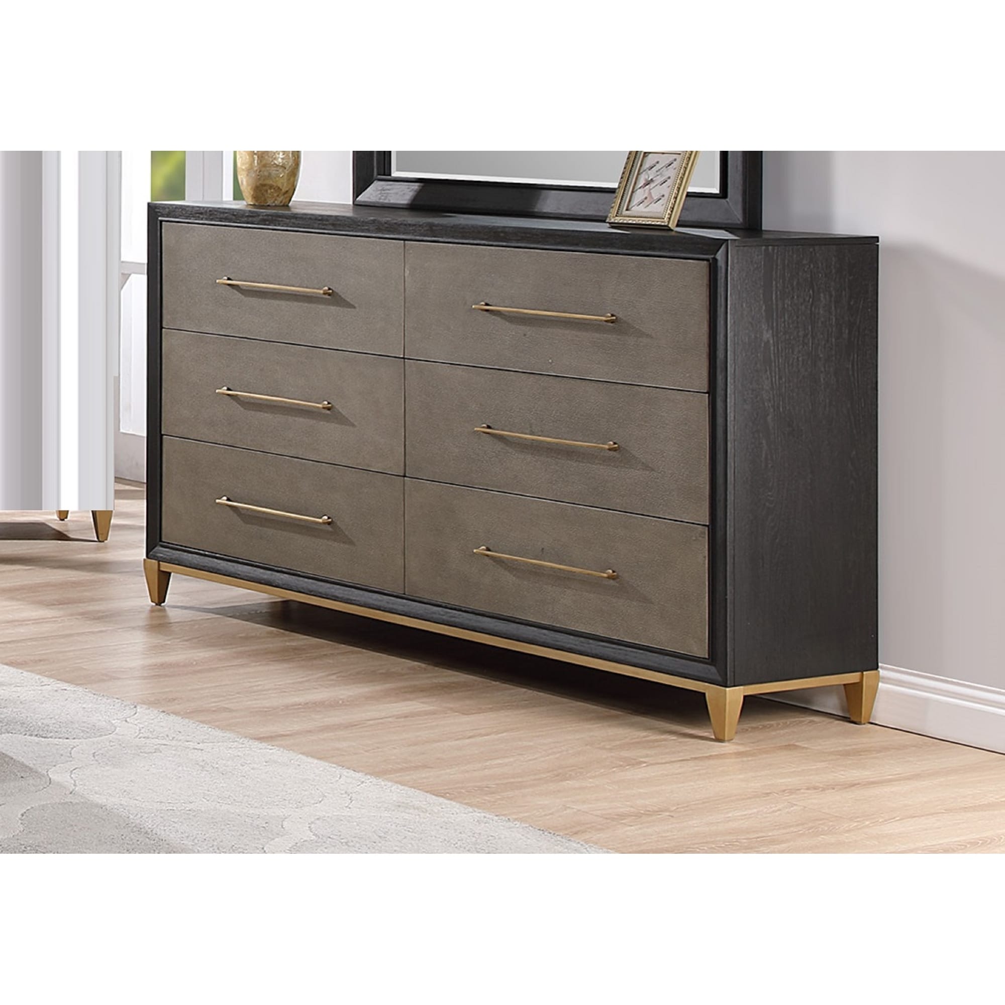 1pc Contemporary Dark Wood Finish Brushed Gold Hardware Tapered Legs Six-Drawers Dresser Wooden