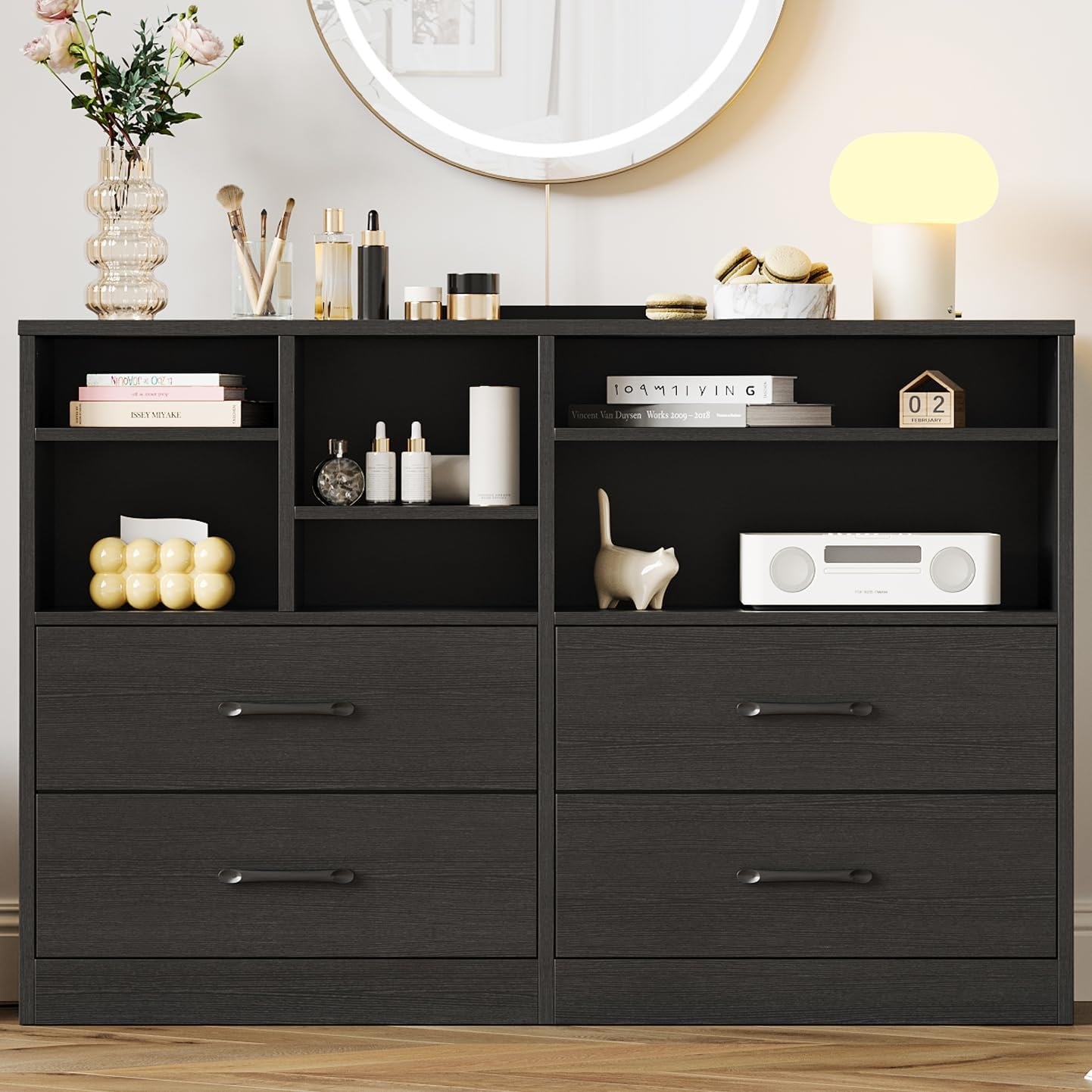 2pcs Bedroom Dresser with 4 Drawers & 6 Open Shelves, Modern Wood Storage Cabinet for Living Room, Black