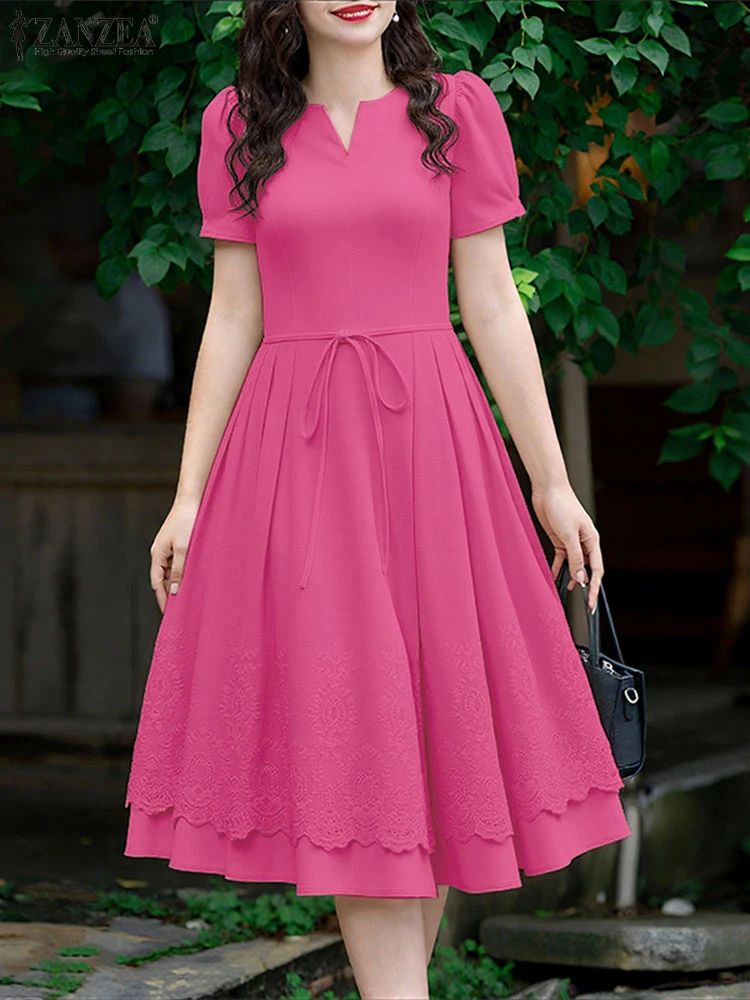 ZANZEA Lace Patchwork Summer Midi Dress With Puff Sleeves Elegant Casual Sundress For Women pink xxxl(us 16)