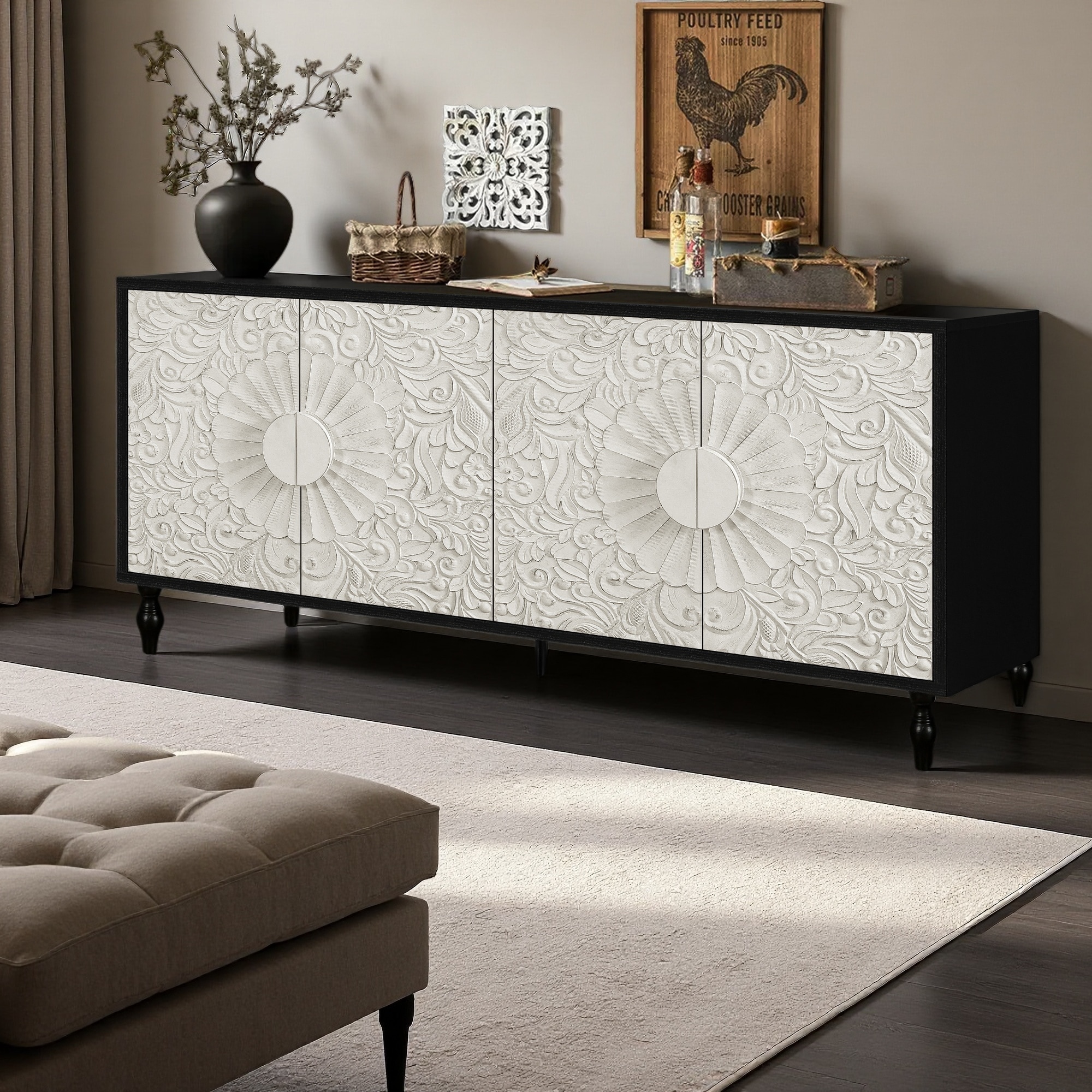 63" TV Stand Cabinet with Carved White Doors & Adjustable Shelves
